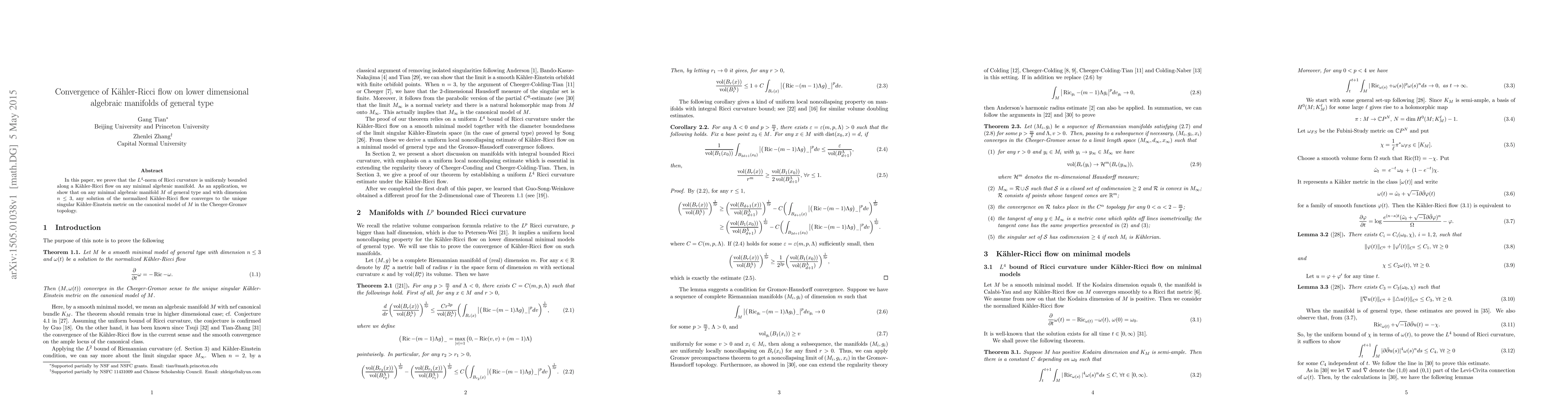 In this paper, we prove that the $L^4$-norm of Ricci curvature is uniformly bounded along a K\"ahler-Ricci flow on any minimal algebraic manifold. As an application, we show that on any minimal algebraic manifold $M$ of general type and with dimension $n\le 3$, any solution of the normalized K\"ahler-Ricci flow converges to the unique singular K\"ahler-Einstein metric on the canonical model of $M$ in the Cheeger-Gromov topology.