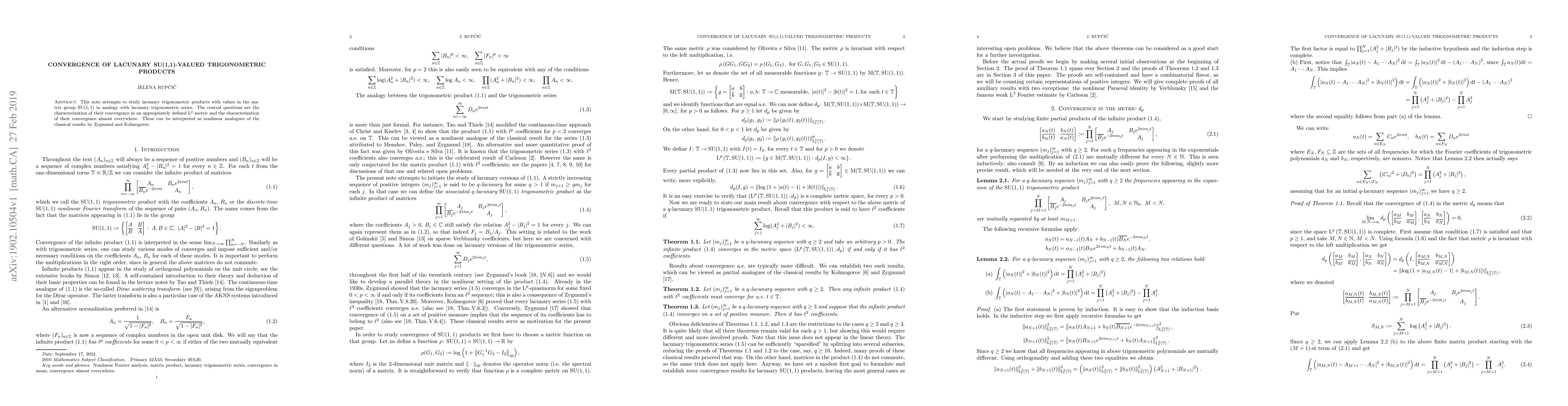 This note attempts to study lacunary trigonometric products with values in the matrix group SU(1,1) in analogy with lacunary trigonometric series. The central questions are the characterization of their convergence in an appropriately define $L^p$-metric and the characterization of their convergence almost everywhere. These can be interpreted as nonlinear analogues of the classical results by Zygmund and Kolmogorov.