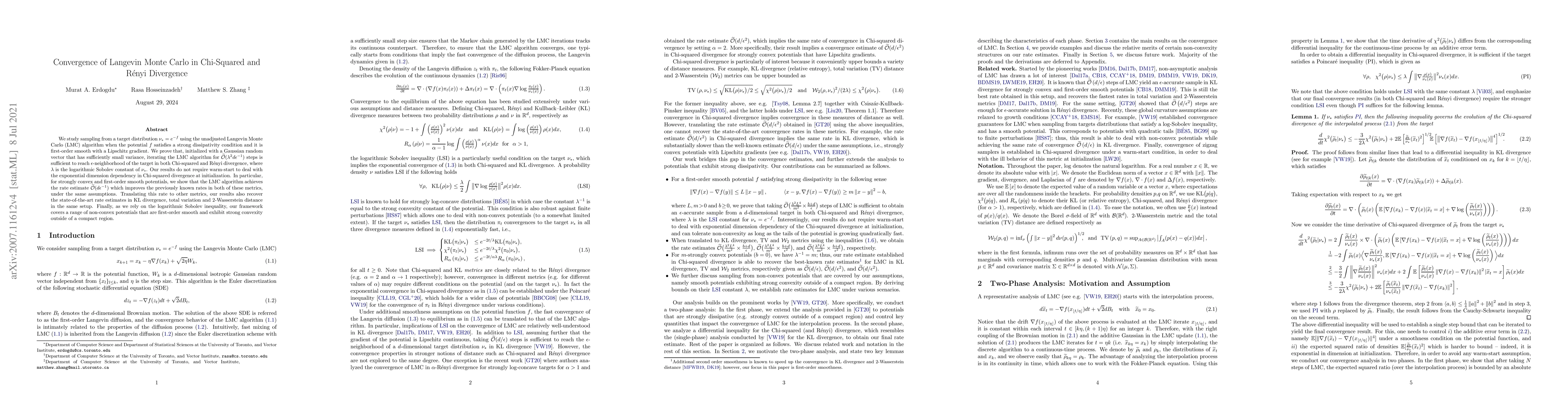 We study sampling from a target distribution $\nu_* = e^{-f}$ using the unadjusted Langevin Monte Carlo (LMC) algorithm when the potential $f$ satisfies a strong dissipativity condition and it is first-order smooth with a Lipschitz gradient. We prove that, initialized with a Gaussian random vector that has sufficiently small variance, iterating the LMC algorithm for $\widetilde{\mathcal{O}}(\lambda^2 d\epsilon^{-1})$ steps is sufficient to reach $\epsilon$-neighborhood of the target in both Chi-squared and Renyi divergence, where $\lambda$ is the logarithmic Sobolev constant of $\nu_*$. Our results do not require warm-start to deal with the exponential dimension dependency in Chi-squared divergence at initialization. In particular, for strongly convex and first-order smooth potentials, we show that the LMC algorithm achieves the rate estimate $\widetilde{\mathcal{O}}(d\epsilon^{-1})$ which improves the previously known rates in both of these metrics, under the same assumptions. Translating this rate to other metrics, our results also recover the state-of-the-art rate estimates in KL divergence, total variation and $2$-Wasserstein distance in the same setup. Finally, as we rely on the logarithmic Sobolev inequality, our framework covers a range of non-convex potentials that are first-order smooth and exhibit strong convexity outside of a compact region.