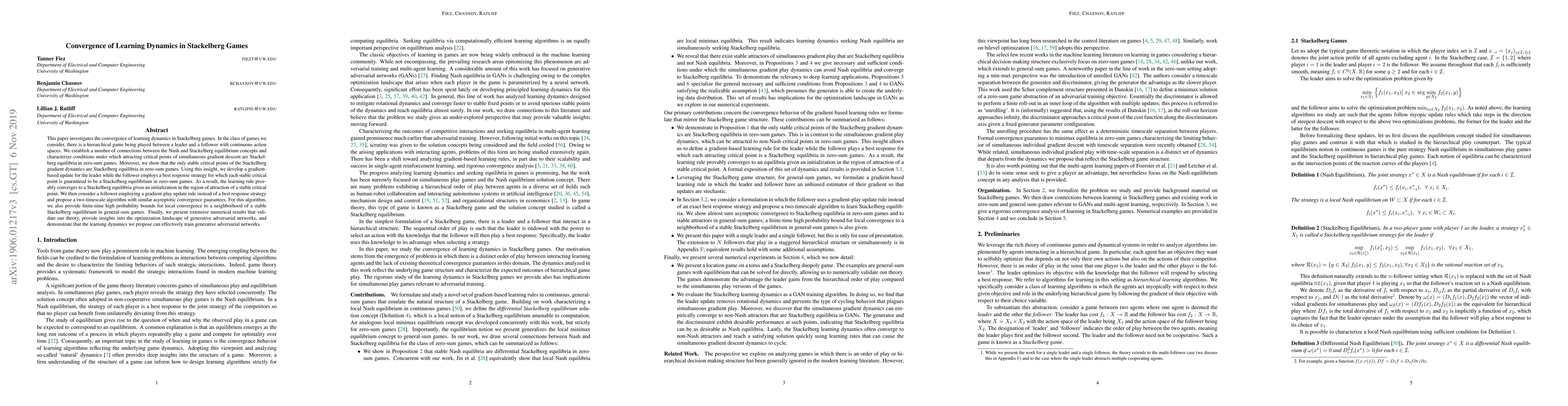 This paper explores the convergence of learning dynamics in Stackelberg games, establishing conditions for gradient-based updates to converge to Stackelberg equilibria in zero-sum games and proposing a two-timescale algorithm for general-sum games with finite-time convergence guarantees. Numerical results validate the theoretical findings and demonstrate effective training of generative adversarial networks.
