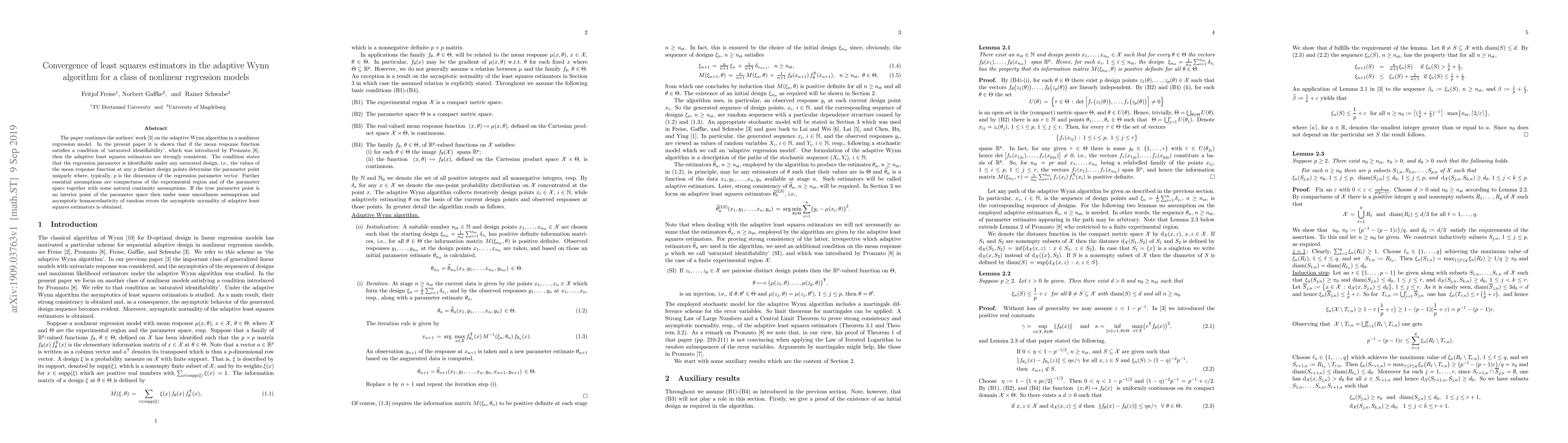 The paper continues the authors' work on the adaptive Wynn algorithm in a nonlinear regression model. In the present paper it is shown that if the mean response function satisfies a condition of `saturated identifiability', which was introduced by Pronzato \cite{Pronzato}, then the adaptive least squares estimators are strongly consistent. The condition states that the regression parameter is identifiable under any saturated design, i.e., the values of the mean response function at any $p$ distinct design points determine the parameter point uniquely where, typically, $p$ is the dimension of the regression parameter vector. Further essential assumptions are compactness of the experimental region and of the parameter space together with some natural continuity assumptions. If the true parameter point is an interior point of the parameter space then under some smoothness assumptions and asymptotic homoscedasticity of random errors the asymptotic normality of adaptive least squares estimators is obtained.