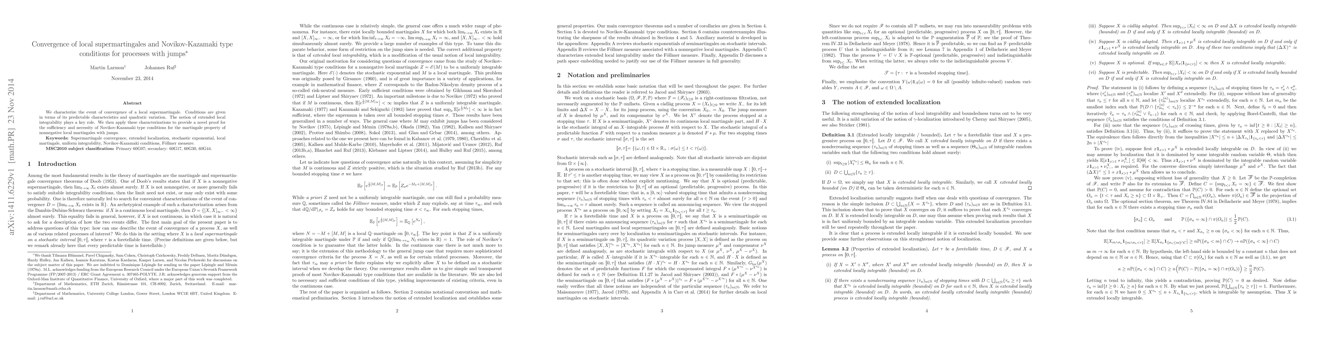We characterize the event of convergence of a local supermartingale. Conditions are given in terms of its predictable characteristics and quadratic variation. The notion of extended local integrability plays a key role. We then apply these characterizations to provide a novel proof for the sufficiency and necessity of Novikov-Kazamaki type conditions for the martingale property of nonnegative local martingales with jumps.