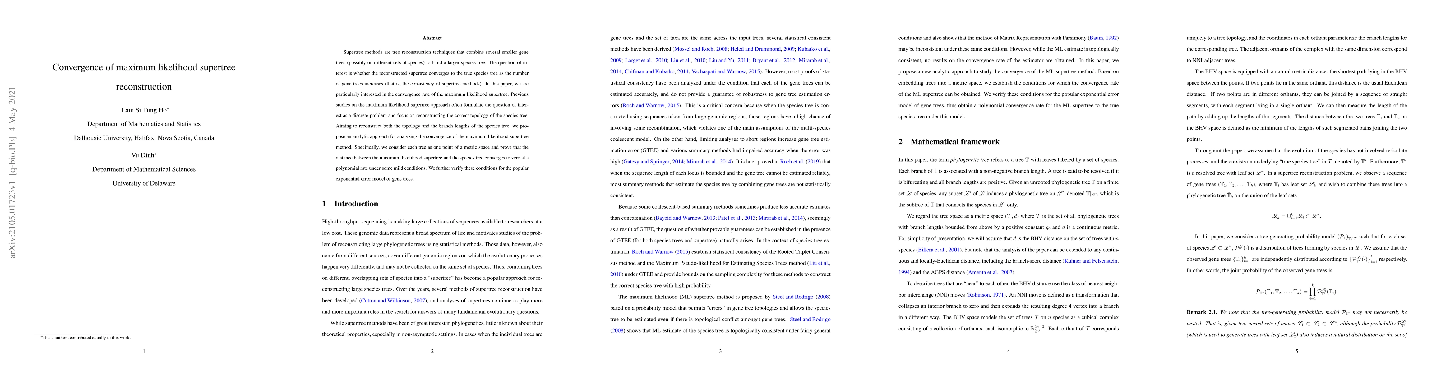 This paper investigates the convergence rate of maximum likelihood supertree reconstruction, focusing on both topology and branch lengths. It proposes an analytic approach to show that the distance between the reconstructed supertree and the true species tree converges to zero at a polynomial rate under mild conditions, verified for the exponential error model of gene trees.