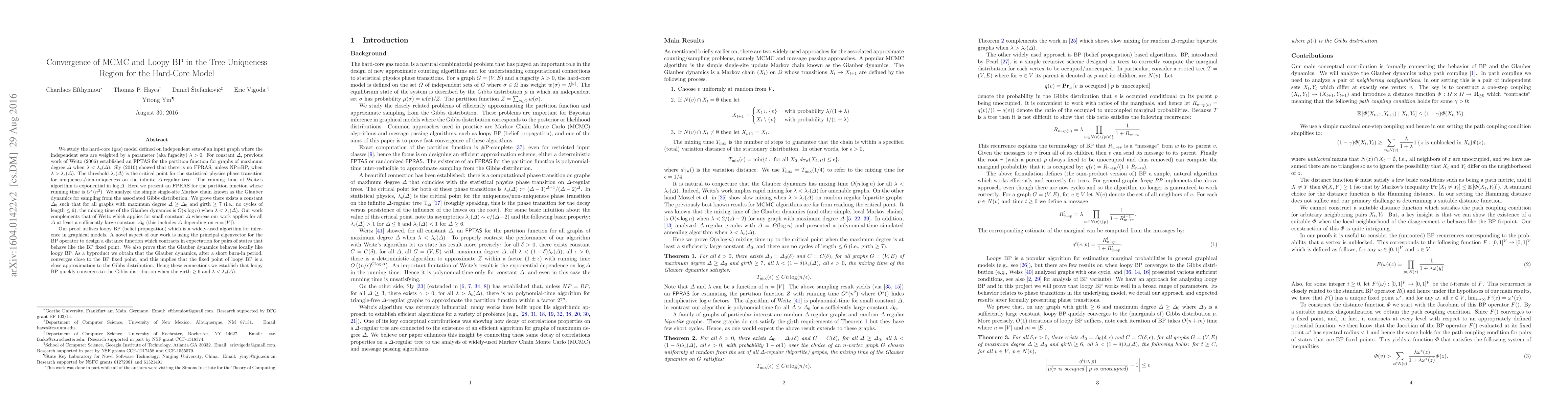 We study the hard-core model defined on independent sets of an input graph where the independent sets are weighted by a parameter $\lambda>0$. For constant $\Delta$, previous work of Weitz (2006) established an FPTAS for the partition function for graphs of maximum degree $\Delta$ when $\lambda< \lambda_c(\Delta)$. The threshold $\lambda_c(\Delta)$ is the critical point for the phase transition for uniqueness/non-uniqueness on the infinite $\Delta$-regular trees. Sly (2010) showed that there is no FPRAS, unless NP=RP, when $\lambda>\lambda_c(\Delta)$. The running time of Weitz's algorithm is exponential in $\log(\Delta)$. Here we present an FPRAS for the partition function whose running time is $O^*(n^2)$. We analyze the simple single-site Glauber dynamics for sampling from the associated Gibbs distribution. We prove there exists a constant $\Delta_0$ such that for all graphs with maximum degree $\Delta\geq\Delta_0$ and girth $\geq 7$, the mixing time of the Glauber dynamics is $O(n\log(n))$ when $\lambda<\lambda_c(\Delta)$. Our work complements that of Weitz which applies for constant $\Delta$ whereas our work applies for all $\Delta \geq \Delta_0$. We utilize loopy BP (belief propagation), a widely-used inference algorithm. A novel aspect of our work is using the principal eigenvector for the BP operator to design a distance function which contracts in expectation for pairs of states that behave like the BP fixed point. We also prove that the Glauber dynamics behaves locally like loopy BP. As a byproduct we obtain that the Glauber dynamics converges, after a short burn-in period, close to the BP fixed point, and this implies that the fixed point of loopy BP is a close approximation to the Gibbs distribution. Using these connections we establish that loopy BP quickly converges to the Gibbs distribution when the girth $\geq 6$ and $\lambda<\lambda_c(\Delta)$.