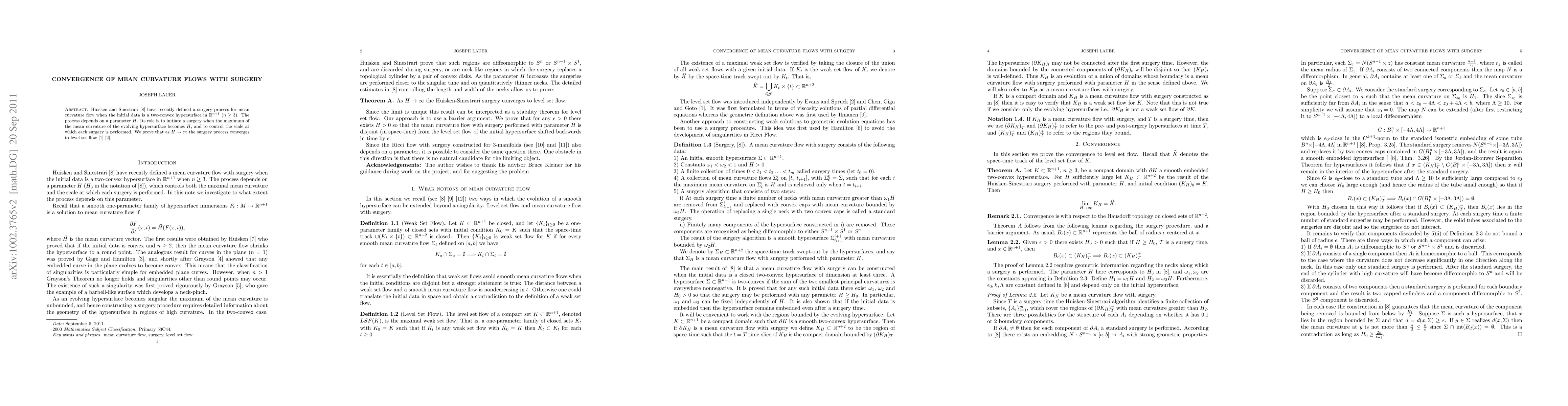 This research proves that as the parameter H in Huisken and Sinestrari's mean curvature flow surgery process for two-convex hypersurfaces approaches infinity, the surgery process converges to level set flow.