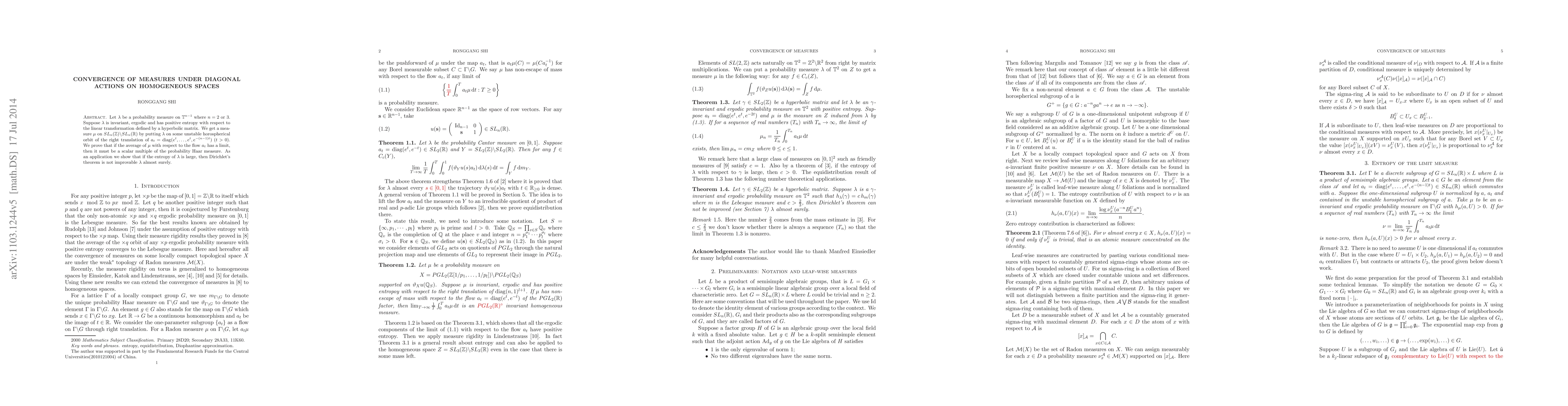 Let $\lambda$ be a probability measure on $\mathbb T^{n-1}$ where $n=2$ or 3. Suppose $\lambda$ is invariant, ergodic and has positive entropy with respect to the linear transformation defined by a hyperbolic matrix. We get a measure $\mu $ on $SL_n(\mathbb Z)\backslash SL_n(\mathbb R)$ by putting $\lambda$ on some unstable horospherical orbit of the right translation of $a_t=\mathrm{diag}(e^t,..., e^t, e^{-(n-1)t})$ $(t>0)$. We prove that if the average of $\mu$ with respect to the flow $a_t$ has a limit, then it must be a scalar multiple of the probability Haar measure. As an application we show that if the entropy of $\lambda$ is large, then Dirichlet's theorem is not improvable $\lambda$ almost surely.