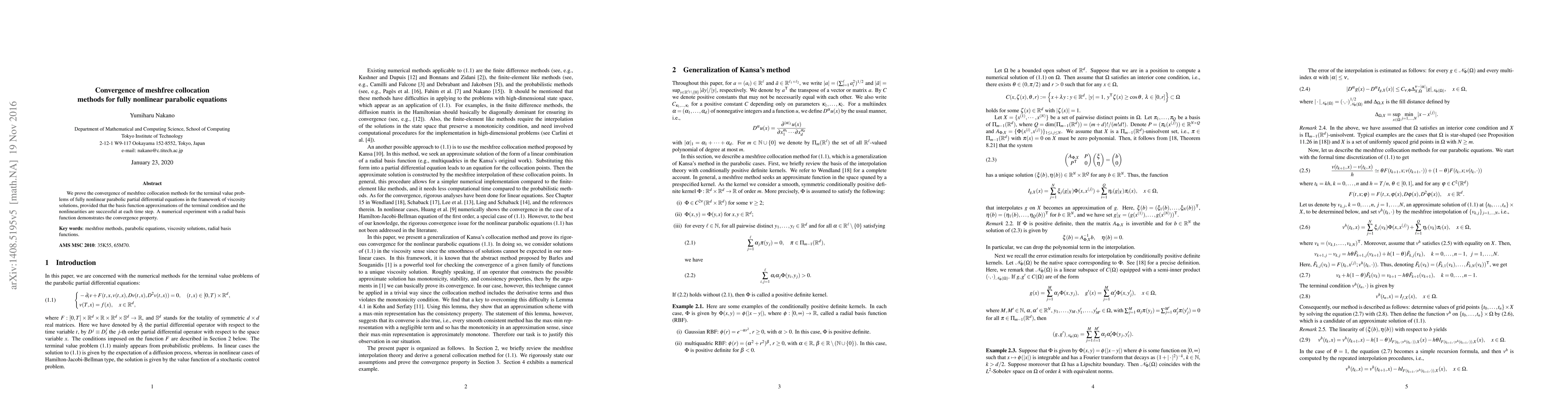 This paper proves the convergence of meshfree collocation methods for solving fully nonlinear parabolic PDEs using viscosity solutions, showing successful approximation through basis functions. The study is validated by a numerical experiment using radial basis functions.