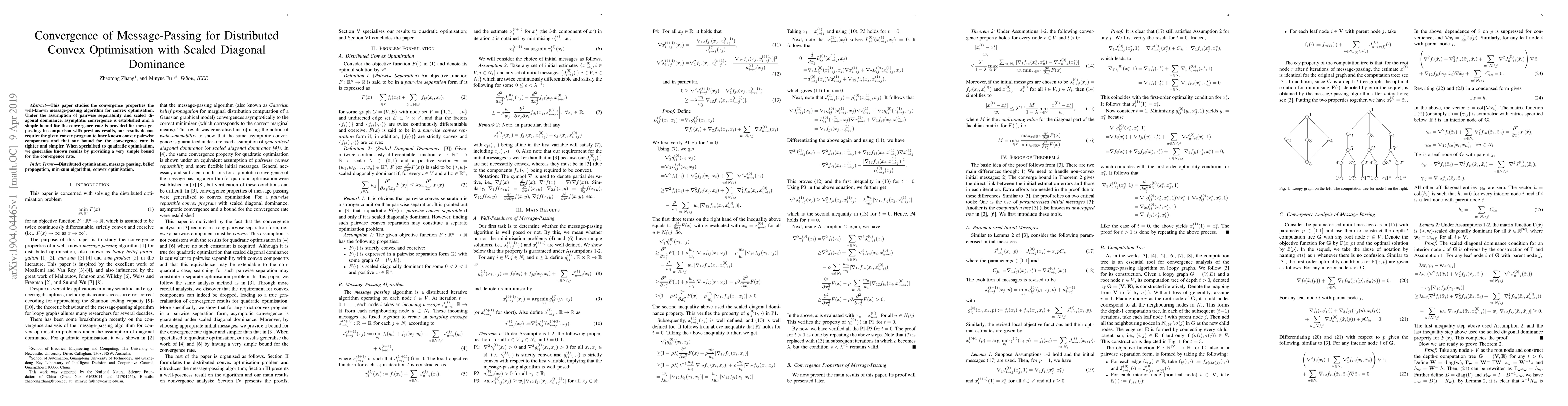 This paper establishes asymptotic convergence for the message-passing algorithm in distributed convex optimisation under scaled diagonal dominance, offering a tighter and simpler convergence rate bound compared to previous results, without requiring known convex pairwise components. For quadratic optimisation, it provides a straightforward convergence rate bound.