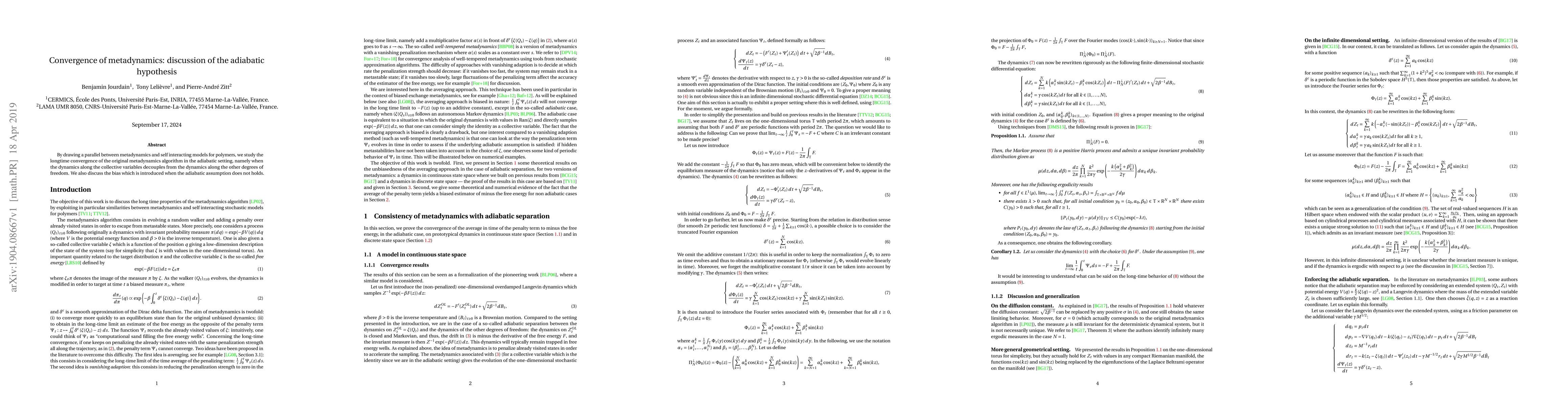 By drawing a parallel between metadynamics and self interacting models for polymers, we study the longtime convergence of the original metadynamics algorithm in the adiabatic setting, namely when the dynamics along the collective variables decouples from the dynamics along the other degrees of freedom. We also discuss the bias which is introduced when the adiabatic assumption does not holds.