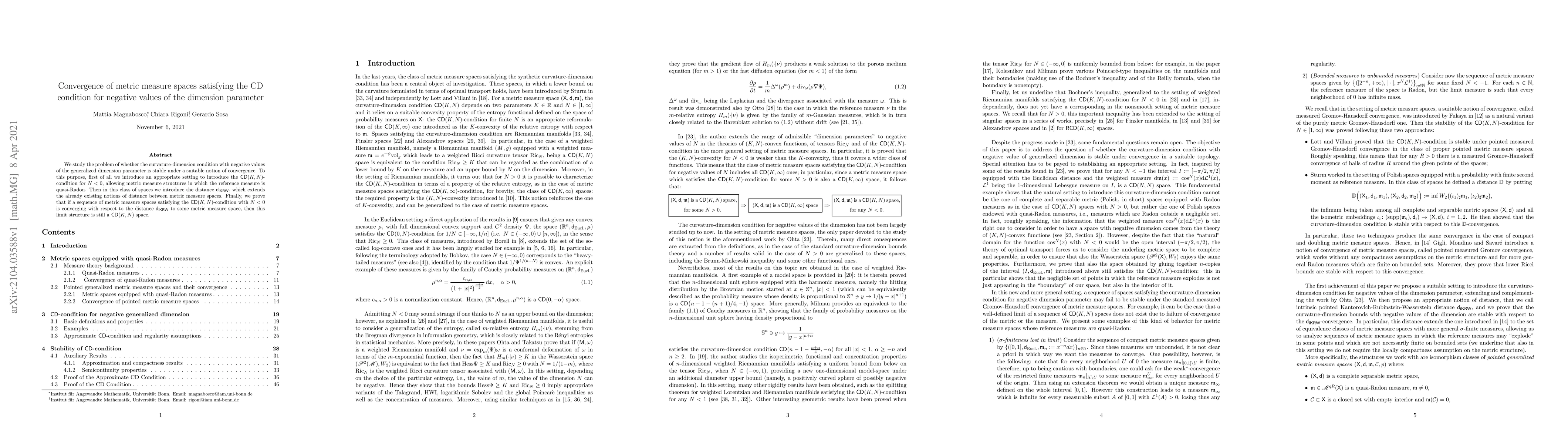 We study the problem of whether the curvature-dimension condition with negative values of the generalized dimension parameter is stable under a suitable notion of convergence. To this purpose, first of all we introduce an appropriate setting to introduce the CD(K, N)-condition for $N < 0$, allowing metric measure structures in which the reference measure is quasi-Radon. Then in this class of spaces we introduce the distance $d_{\mathsf{iKRW}}$, which extends the already existing notions of distance between metric measure spaces. Finally, we prove that if a sequence of metric measure spaces satisfying the CD(K, N)-condition with $N < 0$ is converging with respect to the distance $d_{\mathsf{iKRW}}$ to some metric measure space, then this limit structure is still a CD(K, N) space.