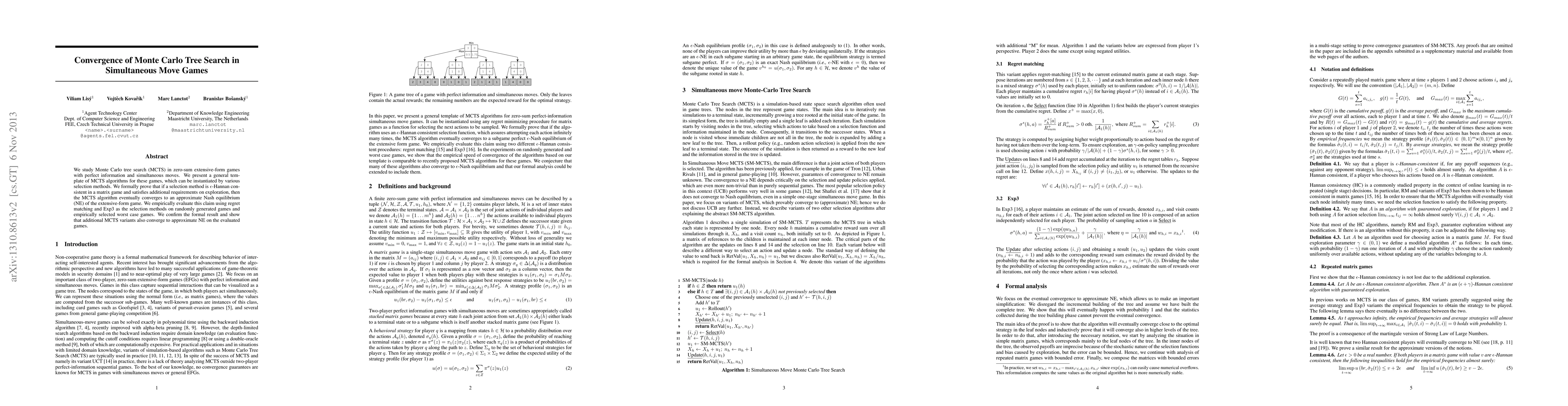 This paper presents a general template for Monte Carlo Tree Search (MCTS) in simultaneous move games, proving its convergence to an approximate Nash equilibrium under certain conditions. Empirical evaluations using regret matching and Exp3 selection methods confirm the theoretical claims.