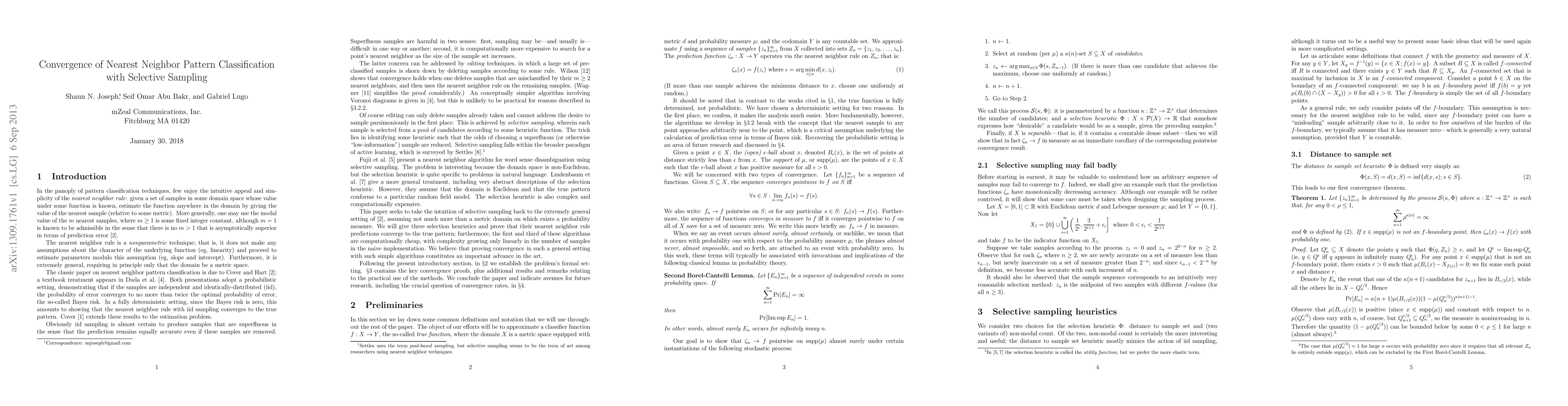 This paper investigates the convergence of the nearest neighbor pattern classification under selective sampling, proving that heuristics can be used to choose samples without sacrificing the original Cover and Hart convergence guarantees. The authors propose three heuristics, two of which are computationally efficient, advancing the field by balancing informative sampling with simplicity.