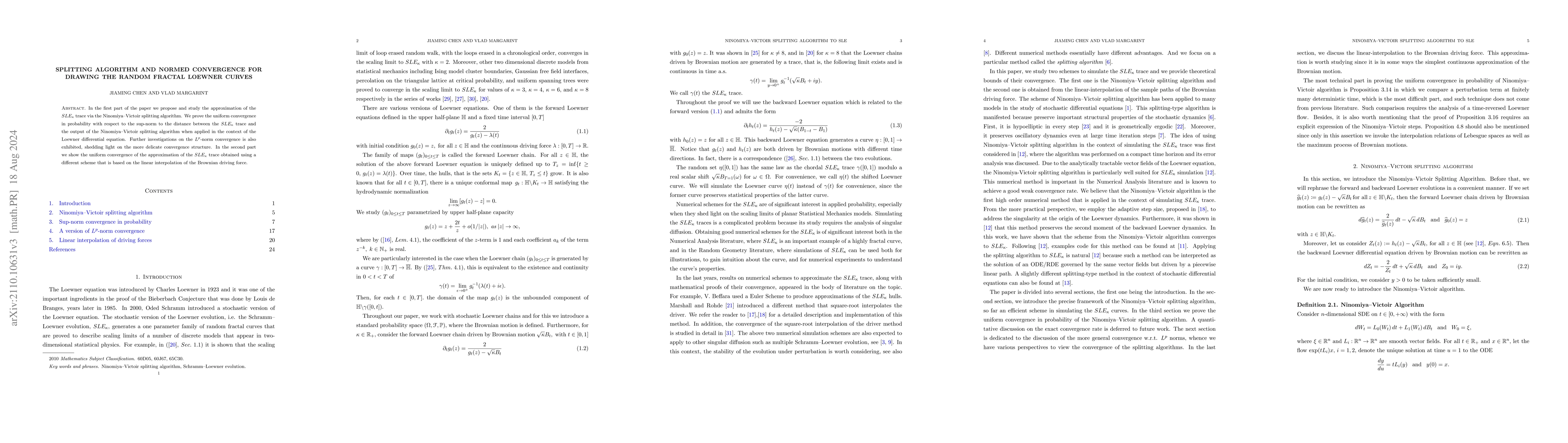 This paper demonstrates strong convergence in probability of the Ninomiya-Victoir Splitting Scheme to Schramm-Loewner Evolution (SLE) traces, proving convergence in the sup-norm and achieving $L^p$ convergence under certain conditions. It also shows uniform convergence using a linear interpolation scheme.