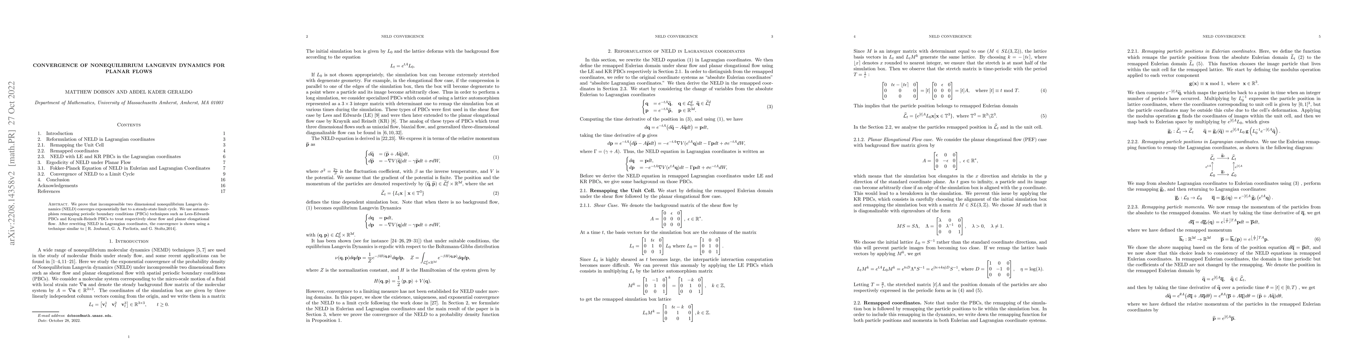 We prove that incompressible two dimensional nonequilibrium Langevin dynamics (NELD) converges exponentially fast to a steady-state limit cycle. We use automorphism remapping periodic boundary conditions (PBCs) techniques such as Lees-Edwards PBCs and Kraynik-Reinelt PBCs to treat respectively shear flow and planar elongational flow. After rewriting NELD in Lagrangian coordinates, the convergence is shown using a technique similar to [R. Joubaud, G. A. Pavliotis, and G. Stoltz,2014].