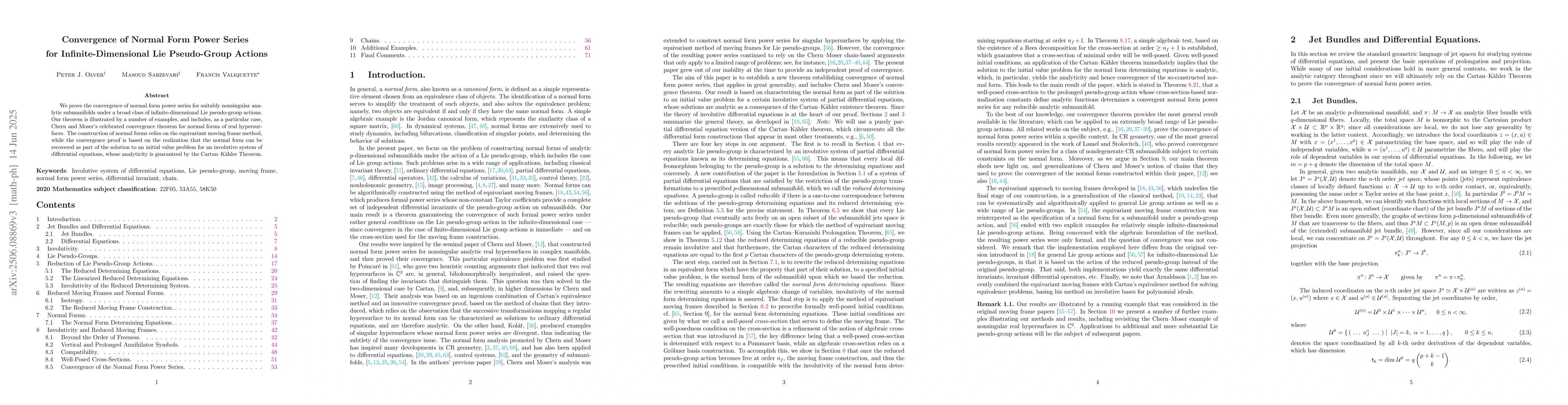 We prove the convergence of normal form power series for suitably nonsingular analytic submanifolds under a broad class of infinite-dimensional Lie pseudo-group actions. Our theorem is illustrated by a number of examples, and includes, as a particular case, Chern and Moser's celebrated convergence theorem for normal forms of real hypersurfaces. The construction of normal forms relies on the equivariant moving frame method, while the convergence proof is based on the realization that the normal form can be recovered as part of the solution to an initial value problem for an involutive system of differential equations, whose analyticity is guaranteed by the Cartan-K\"ahler Theorem.