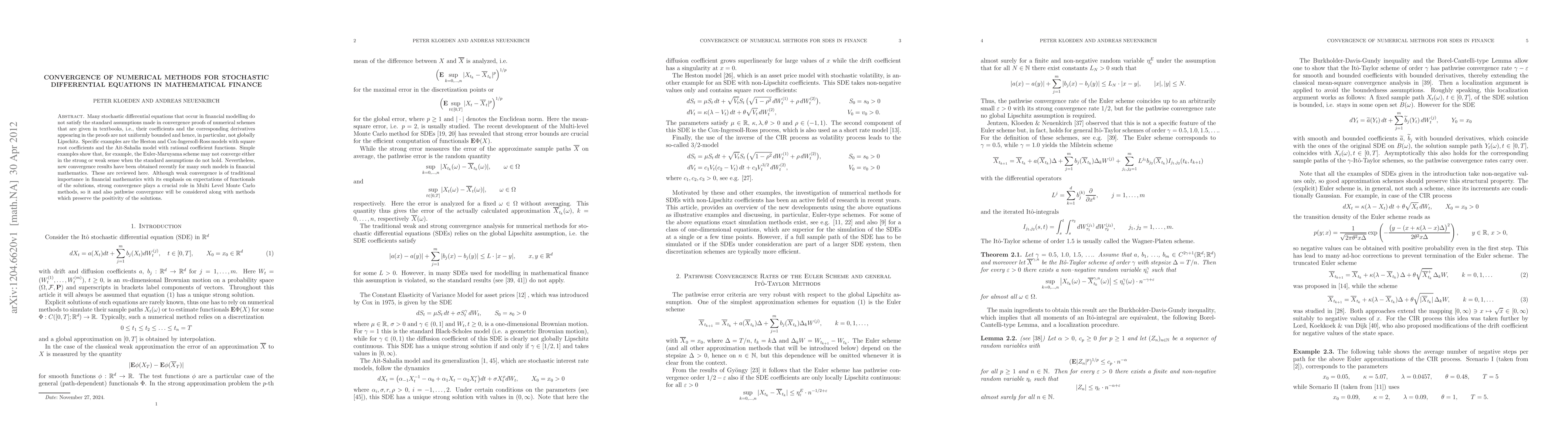 This paper reviews recent convergence results for numerical methods applied to stochastic differential equations in financial modeling, particularly those that do not meet standard assumptions like uniform boundedness. It highlights the importance of both weak and strong convergence, especially in the context of Multi Level Monte Carlo methods, and discusses methods that ensure solution positivity.