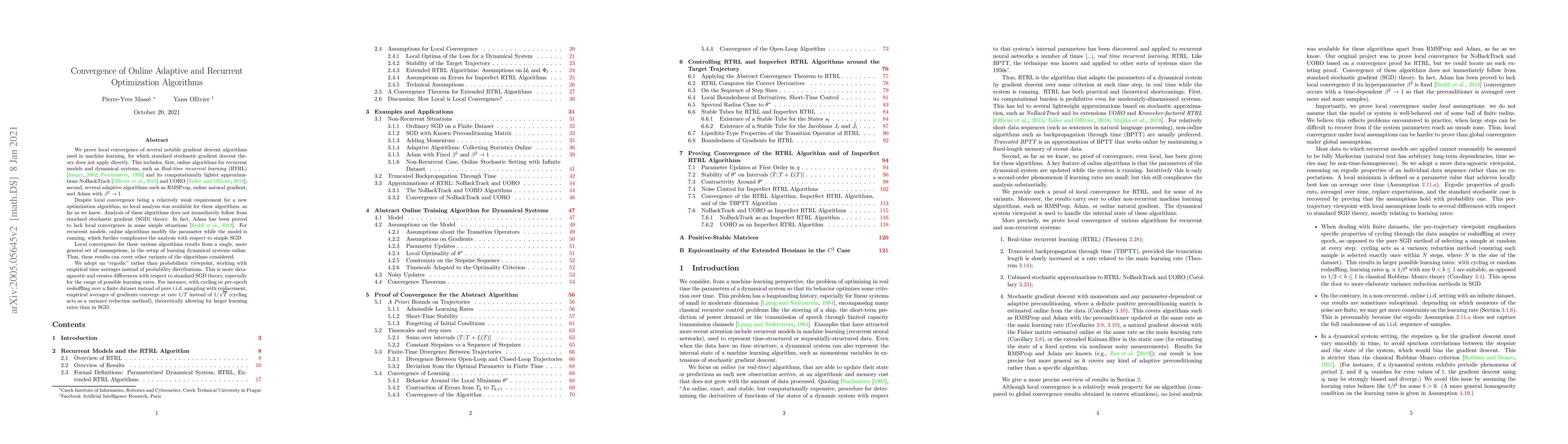 This paper proves local convergence for several advanced gradient descent algorithms, including online adaptive methods and recurrent optimization techniques like RTRL, which are not covered by standard stochastic gradient descent theory. The analysis adopts an ergodic approach, allowing for larger learning rates and accommodating data shuffling methods.