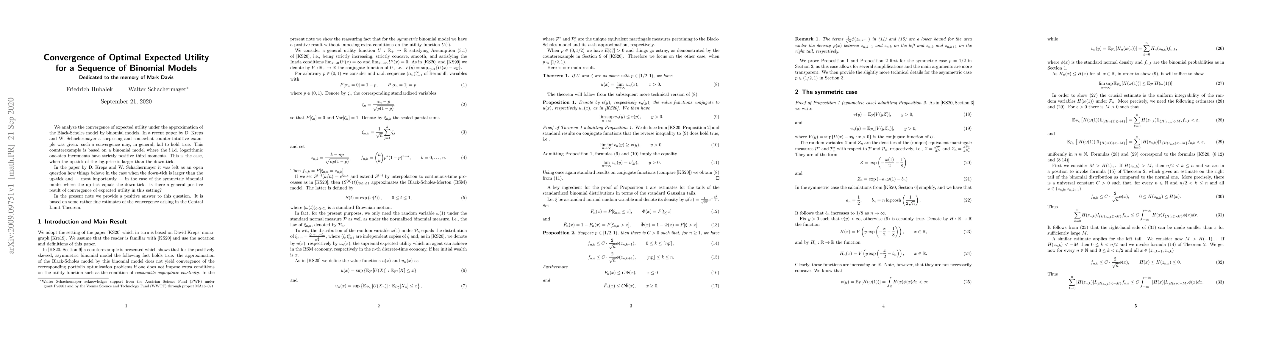 We analyze the convergence of expected utility under the approximation of the Black-Scholes model by binomial models. In a recent paper by D. Kreps and W. Schachermayer a surprising and somewhat counter-intuitive example was given: such a convergence may, in general, fail to hold true. This counterexample is based on a binomial model where the i.i.d. logarithmic one-step increments have strictly positive third moments. This is the case, when the up-tick of the log-price is larger than the down-tick. In the paper by D. Kreps and W. Schachermayer it was left as an open question how things behave in the case when the down-tick is larger than the up-tick and -- most importantly -- in the case of the symmetric binomial model where the up-tick equals the down-tick. Is there a general positive result of convergence of expected utility in this setting? In the present note we provide a positive answer to this question. It is based on some rather fine estimates of the convergence arising in the Central Limit Theorem.