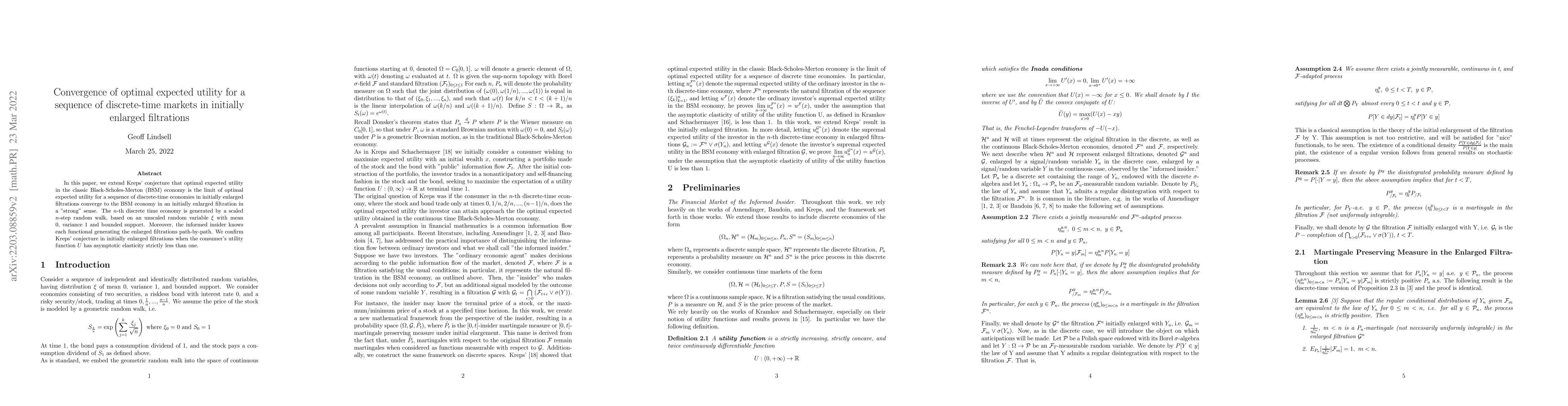 This paper confirms Kreps' conjecture that optimal expected utility in the BSM economy is the limit of optimal expected utility from a sequence of discrete-time economies, showing convergence in initially enlarged filtrations. It applies to utility functions with asymptotic elasticity strictly less than one.