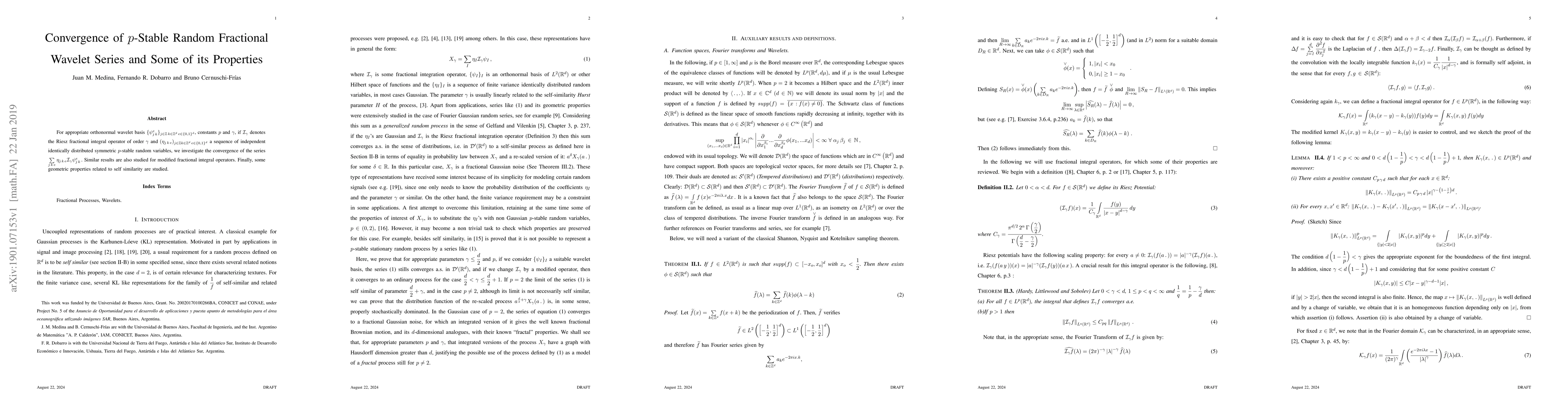 For appropriate orthonormal wavelet basis $\{\psi_{j\,k}^e \}_{j\in\mathbb{Z}\,k\in\mathbb{Z}^d\,e\in\{0,1\}^d}$, constants $p$ and $\gamma$, if $\mathcal{I}_{\gamma}$ denotes the Riesz fractional integral operator of order $\gamma$ and $(\eta_{j\,k\,e})_{j\in\mathbb{Z} k\in\mathbb{Z}^d \,e\in\{0,1\}^d}$ a sequence of independent identically distributed symmetric $p$-stable random variables, we investigate the convergence of the series $\sum\limits_{j\,k\,e} \eta_{j\,k\,e} \mathcal{I}_{\gamma} \psi_{j\,k\,}^e$. Similar results are also studied for modified fractional integral operators. Finally, some geometric properties related to self similarity are studied.