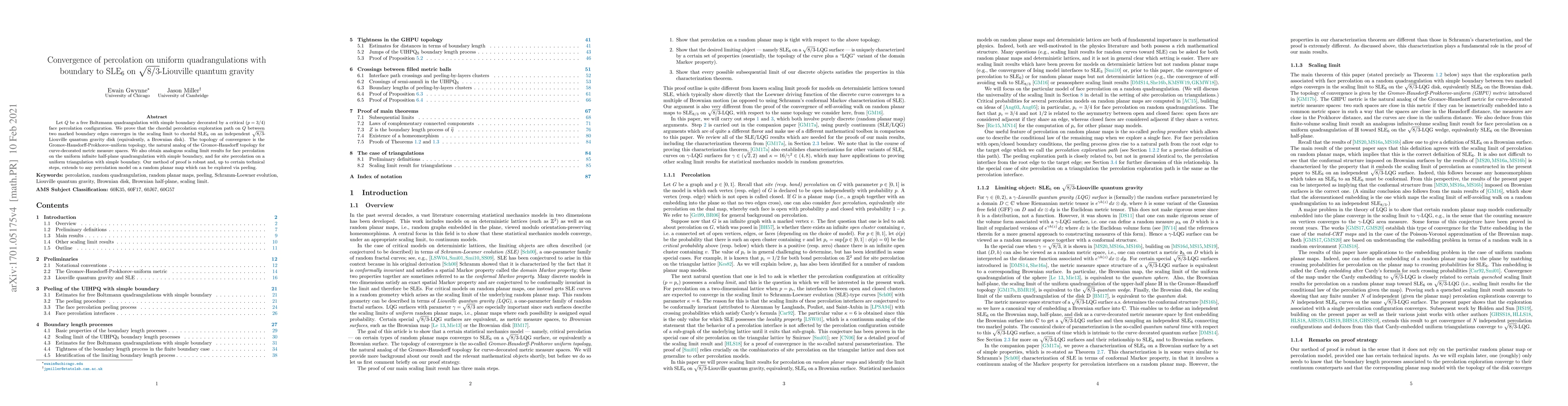 This paper demonstrates the convergence of percolation on uniform quadrangulations with boundary to SLE$_6$ on $\sqrt{8/3}$-Liouville quantum gravity, establishing a scaling limit result in the Gromov-Hausdorff-Prokhorov-uniform topology. The method is shown to be applicable to various percolation models on random planar maps.
