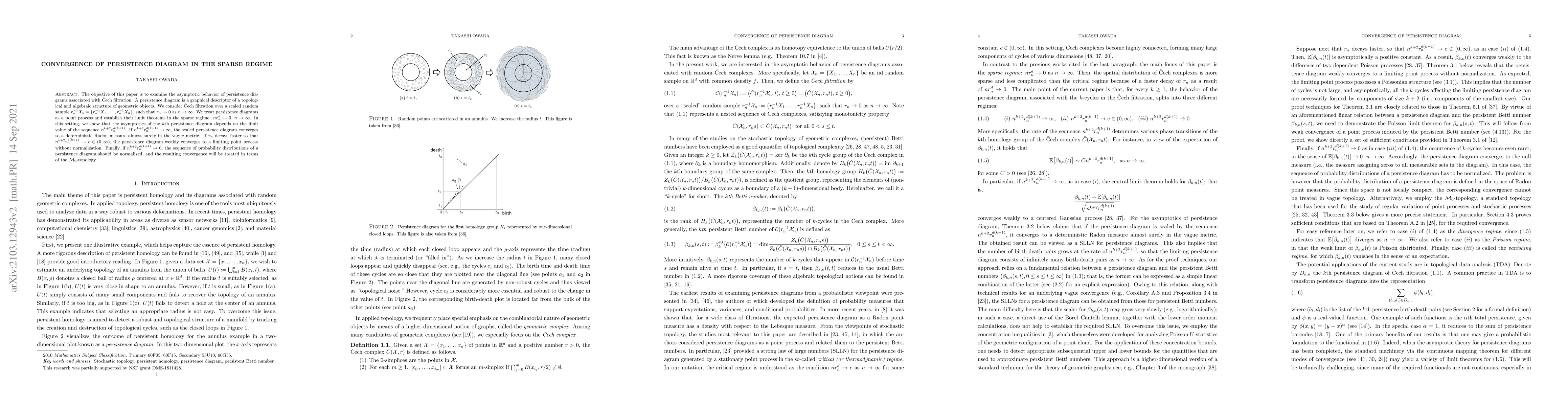 The objective of this paper is to examine the asymptotic behavior of persistence diagrams associated with \v{C}ech filtration. A persistence diagram is a graphical descriptor of a topological and algebraic structure of geometric objects. We consider \v{C}ech filtration over a scaled random sample $r_n^{-1}\mathcal X_n = \{ r_n^{-1}X_1,\dots, r_n^{-1}X_n \}$, such that $r_n\to 0$ as $n\to\infty$. We treat persistence diagrams as a point process and establish their limit theorems in the sparse regime: $nr_n^d\to0$, $n\to\infty$. In this setting, we show that the asymptotics of the $k$th persistence diagram depends on the limit value of the sequence $n^{k+2}r_n^{d(k+1)}$. If $n^{k+2}r_n^{d(k+1)} \to \infty$, the scaled persistence diagram converges to a deterministic Radon measure almost surely in the vague metric. If $r_n$ decays faster so that $n^{k+2}r_n^{d(k+1)} \to c\in (0,\infty)$, the persistence diagram weakly converges to a limiting point process without normalization. Finally, if $n^{k+2}r_n^{d(k+1)} \to 0$, the sequence of probability distributions of a persistence diagram should be normalized, and the resulting convergence will be treated in terms of the $\mathcal M_0$-topology.