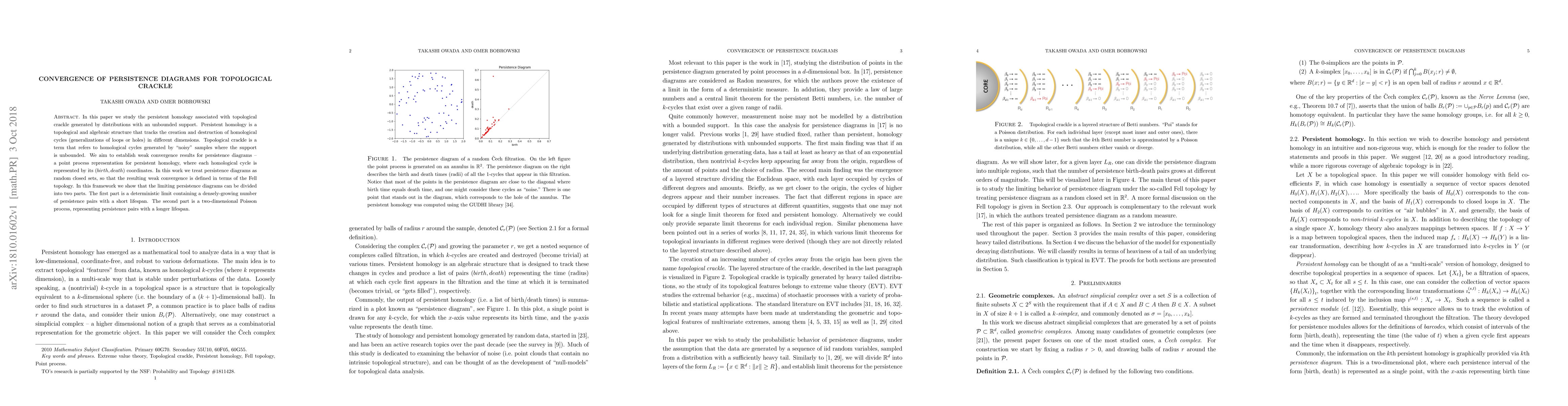 In this paper we study the persistent homology associated with topological crackle generated by distributions with an unbounded support. Persistent homology is a topological and algebraic structure that tracks the creation and destruction of homological cycles (generalizations of loops or holes) in different dimensions. Topological crackle is a term that refers to homological cycles generated by "noisy" samples where the support is unbounded. We aim to establish weak convergence results for persistence diagrams - a point process representation for persistent homology, where each homological cycle is represented by its (birth,death) coordinates. In this work we treat persistence diagrams as random closed sets, so that the resulting weak convergence is defined in terms of the Fell topology. In this framework we show that the limiting persistence diagrams can be divided into two parts. The first part is a deterministic limit containing a densely-growing number of persistence pairs with a short lifespan. The second part is a two-dimensional Poisson process, representing persistence pairs with a longer lifespan.