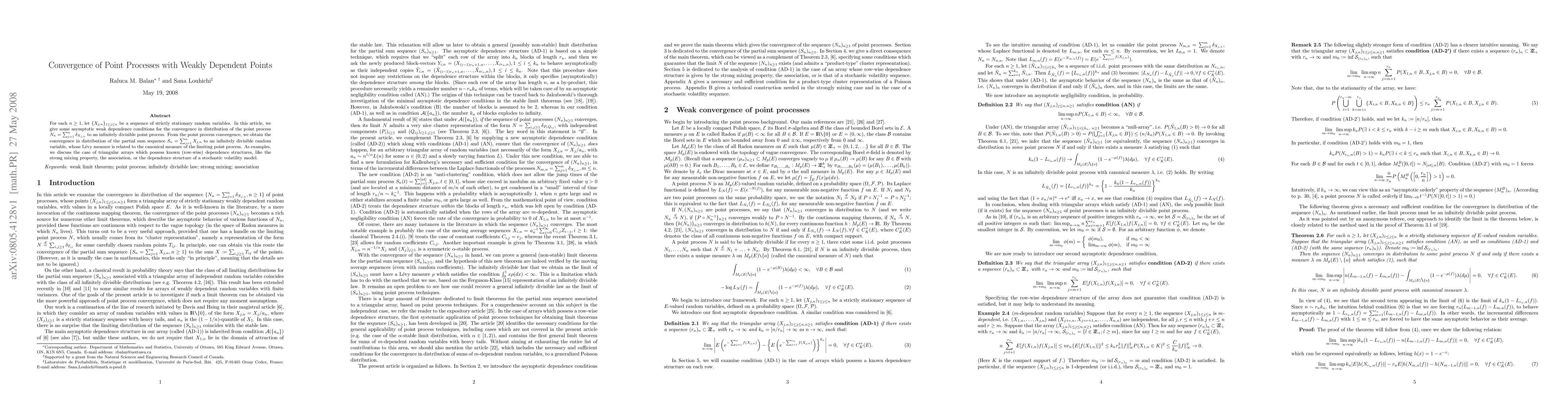 For each $n \geq 1$, let $\{X_{j,n}\}_{1 \leq j \leq n}$ be a sequence of strictly stationary random variables. In this article, we give some asymptotic weak dependence conditions for the convergence in distribution of the point process $N_n=\sum_{j=1}^{n}\delta_{X_{j,n}}$ to an infinitely divisible point process. From the point process convergence, we obtain the convergence in distribution of the partial sum sequence $S_n=\sum_{j=1}^{n}X_{j,n}$ to an infinitely divisible random variable, whose L\'{e}vy measure is related to the canonical measure of the limiting point process. As examples, we discuss the case of triangular arrays which possess known (row-wise) dependence structures, like the strong mixing property, the association, or the dependence structure of a stochastic volatility model.