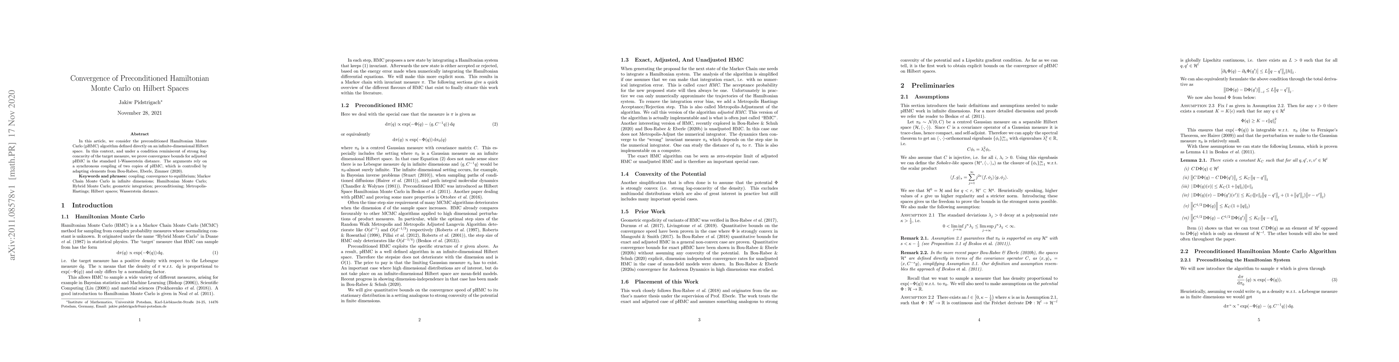 This paper proves convergence bounds for preconditioned Hamiltonian Monte Carlo on infinite-dimensional Hilbert spaces under certain conditions, showing the algorithm can achieve strong log-concavity of target measures.