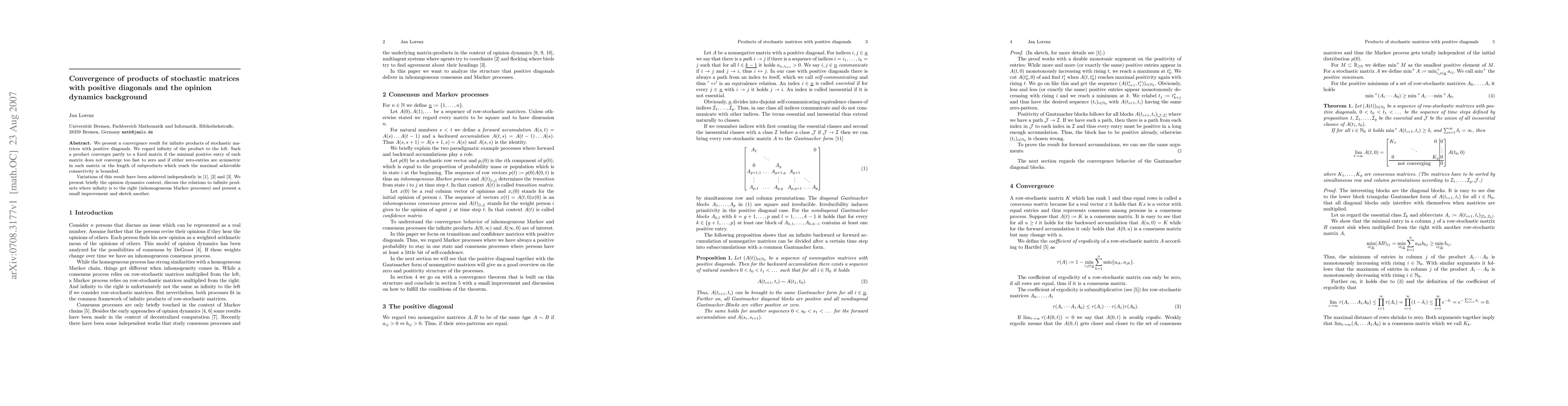 The paper demonstrates the convergence of infinite products of stochastic matrices with positive diagonals under specific conditions, relating these results to opinion dynamics and inhomogeneous Markov processes. It also discusses improvements over prior works from 2005.