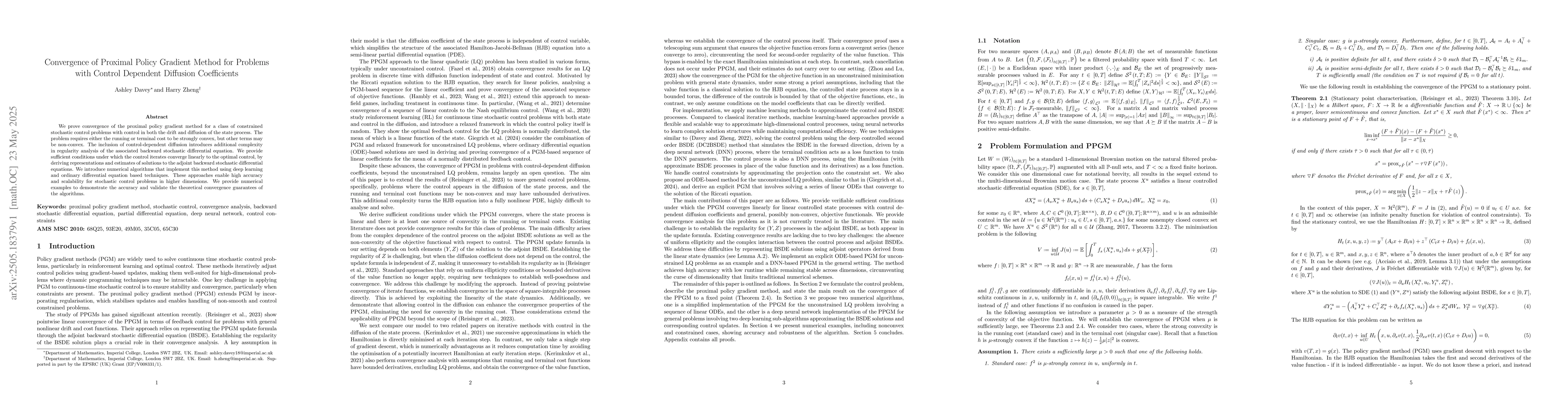 The work extends proximal policy gradient methods to stochastic control problems with control-dependent diffusion coefficients, addressing the increased complexity through regularity analysis and adjoint BSDE representations.