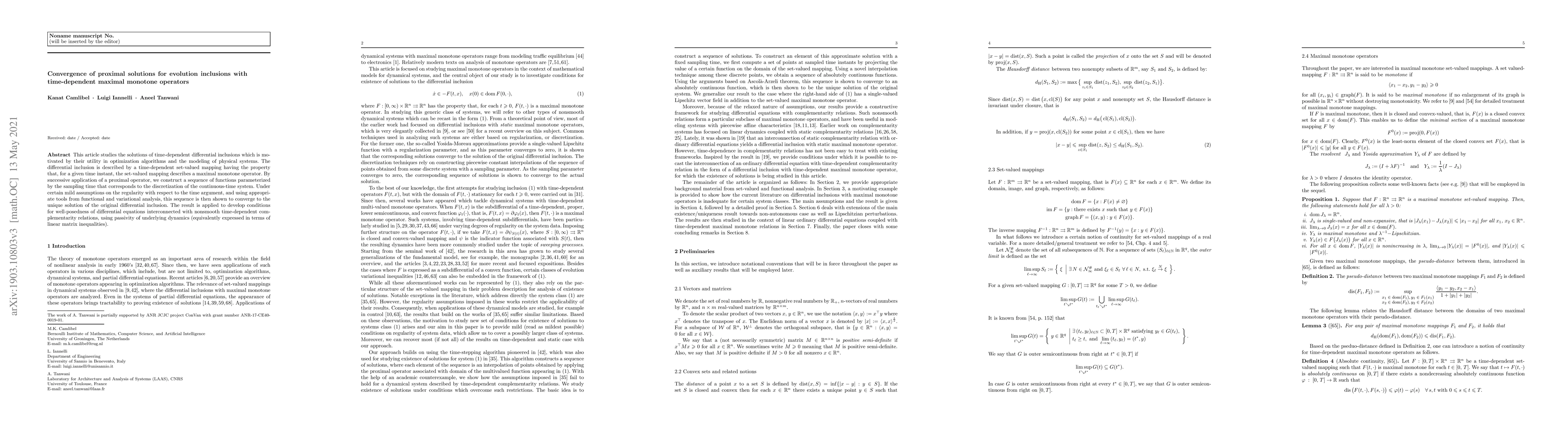 This paper investigates the convergence of proximal solutions for time-dependent differential inclusions governed by maximal monotone operators, demonstrating the convergence of discretized sequences to the unique solution under mild regularity conditions. The findings are applied to establish well-posedness conditions for related nonsmooth time-dependent complementarity problems.