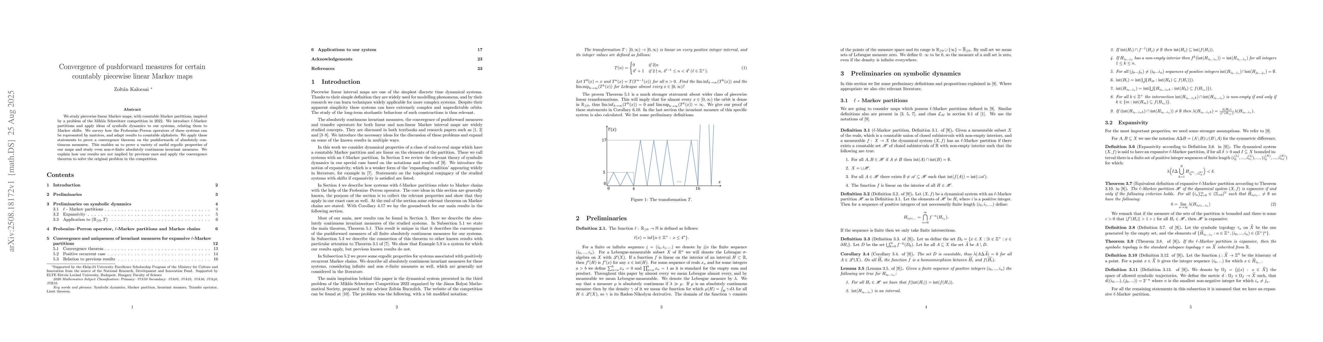 We study piecewise linear Markov maps, with countable Markov partitions, inspired by a problem of the Mikl\'os Schweitzer competition in 2022. We introduce $\ell$-Markov partitions and apply ideas of symbolic dynamics to our systems, relating them to Markov shifts. We survey how the Frobenius--Perron operators of these systems can be represented by matrices, and adapt results to countable alphabets. We apply these statements to prove a convergence theorem on the pushforwards of absolutely continuous measures. This enables us to prove a variety of useful ergodic properties of our maps and study even non-$\sigma$-finite absolutely continuous invariant measures. We explain how our results are not implied by previous ones and apply the convergence theorem to solve the original problem in the competition.