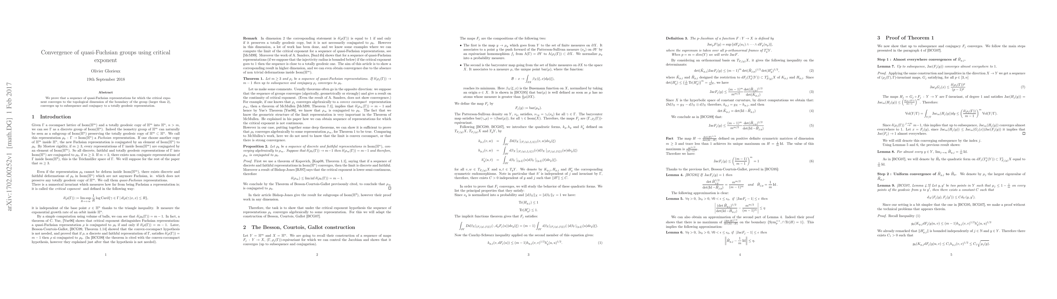 Summary: This paper demonstrates that a sequence of quasi-Fuchsian representations converging in critical exponent to the topological dimension of their boundary (greater than 2) converges, up to subsequence and conjugacy, to a totally geodesic representation.