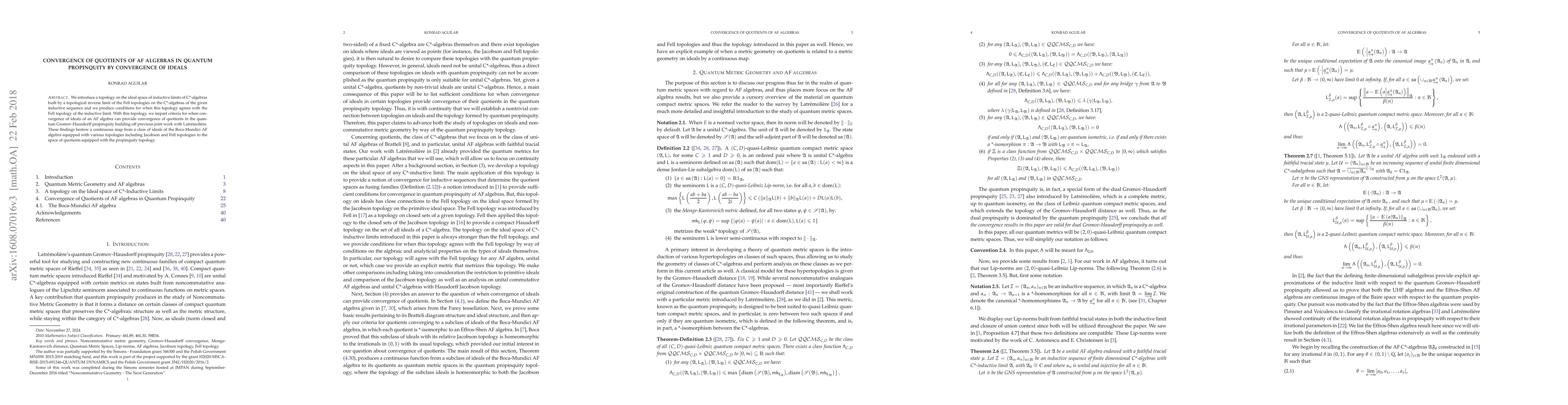 This paper establishes a topology on the ideal space of inductive limits of C*-algebras, aligning it with the Fell topology under specific conditions. It provides criteria for convergence of quotients of AF algebras in the quantum Gromov-Hausdorff propinquity and constructs a continuous map linking various ideal topologies to the quotient space.
