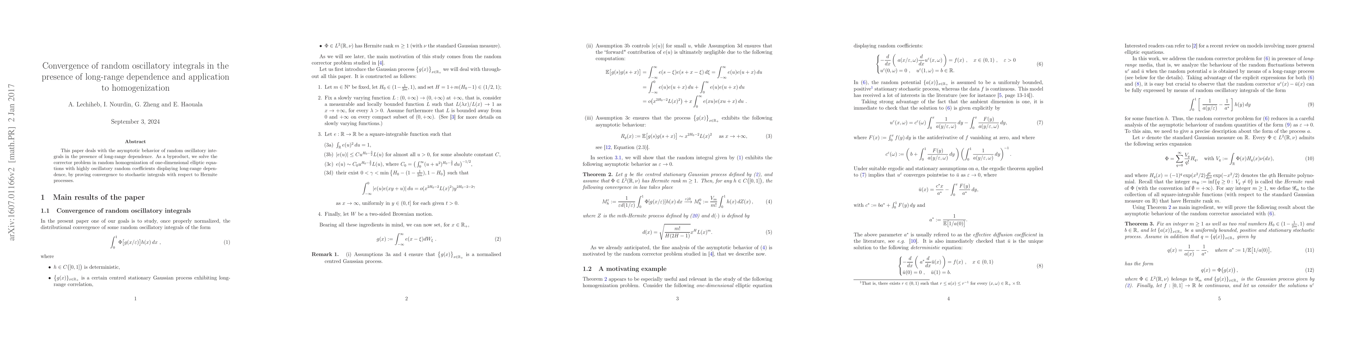 This paper investigates the asymptotic behavior of random oscillatory integrals under long-range dependence and applies the findings to solve the corrector problem in homogenizing one-dimensional elliptic equations with highly oscillatory, long-range dependent random coefficients, proving convergence to stochastic integrals with Hermite processes.