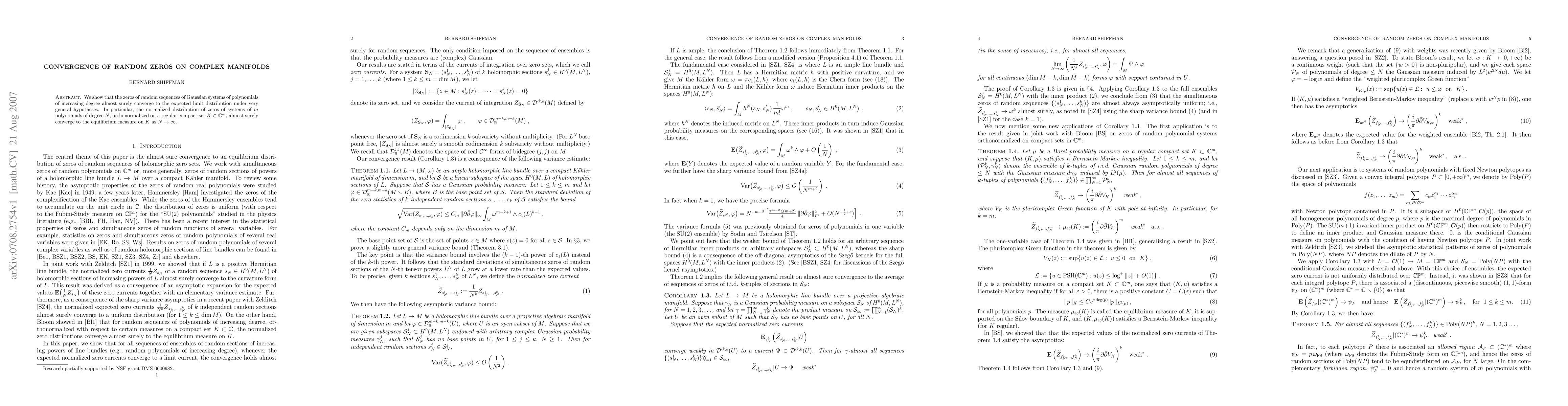 We show that the zeros of random sequences of Gaussian systems of polynomials of increasing degree almost surely converge to the expected limit distribution under very general hypotheses. In particular, the normalized distribution of zeros of systems of m polynomials of degree N, orthonormalized on a regular compact subset K of C^m, almost surely converge to the equilibrium measure on K as the degree N goes to infinity.