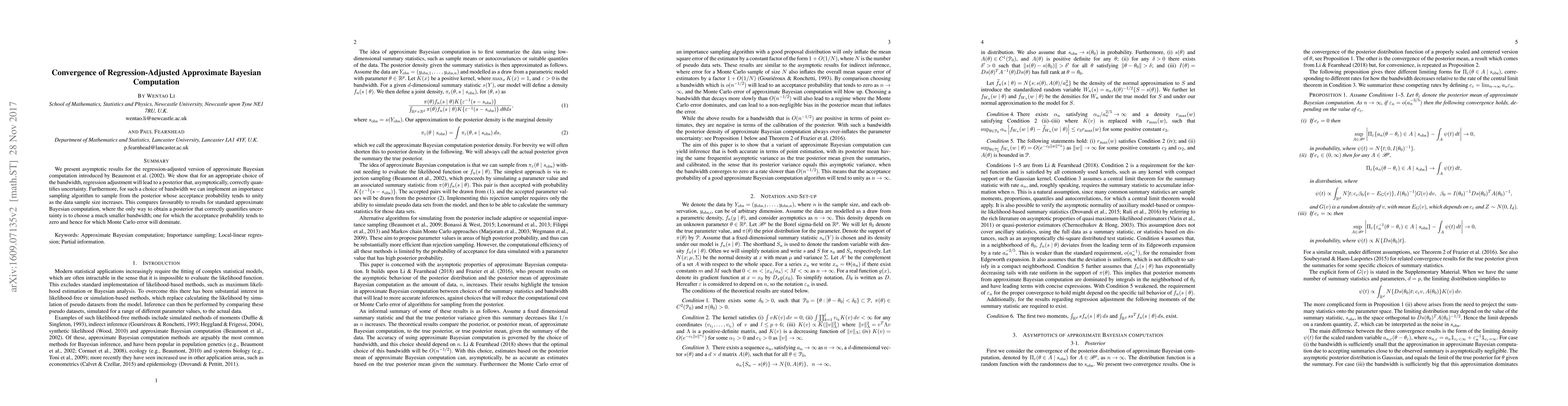 We present asymptotic results for the regression-adjusted version of approximate Bayesian computation introduced by Beaumont(2002). We show that for an appropriate choice of the bandwidth, regression adjustment will lead to a posterior that, asymptotically, correctly quantifies uncertainty. Furthermore, for such a choice of bandwidth we can implement an importance sampling algorithm to sample from the posterior whose acceptance probability tends to unity as the data sample size increases. This compares favourably to results for standard approximate Bayesian computation, where the only way to obtain a posterior that correctly quantifies uncertainty is to choose a much smaller bandwidth; one for which the acceptance probability tends to zero and hence for which Monte Carlo error will dominate.