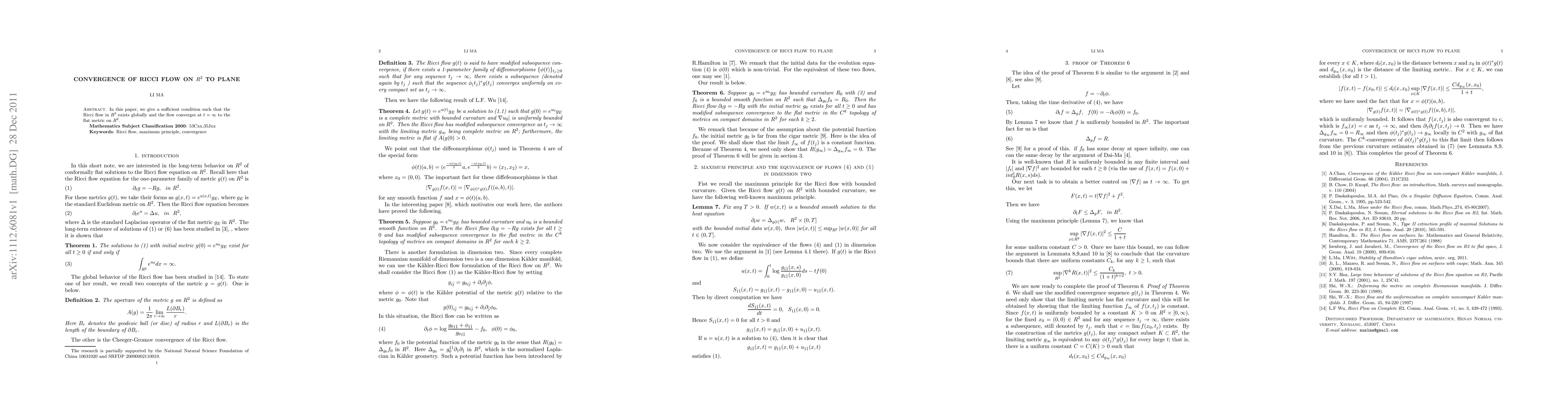 The paper provides a condition for Ricci flow in 2D space to converge to a flat metric at infinity, ensuring global existence of the flow.