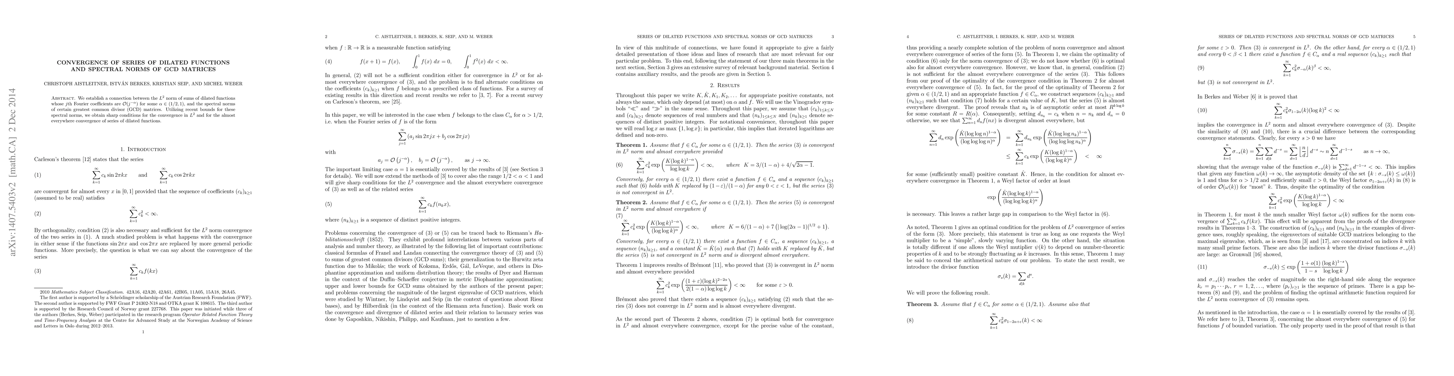 This paper connects the $L^2$ norm of sums of dilated functions with $\mathcal{O}(j^{-\alpha})$ Fourier coefficients to the spectral norms of GCD matrices, deriving sharp convergence conditions for both $L^2$ and almost everywhere convergence.