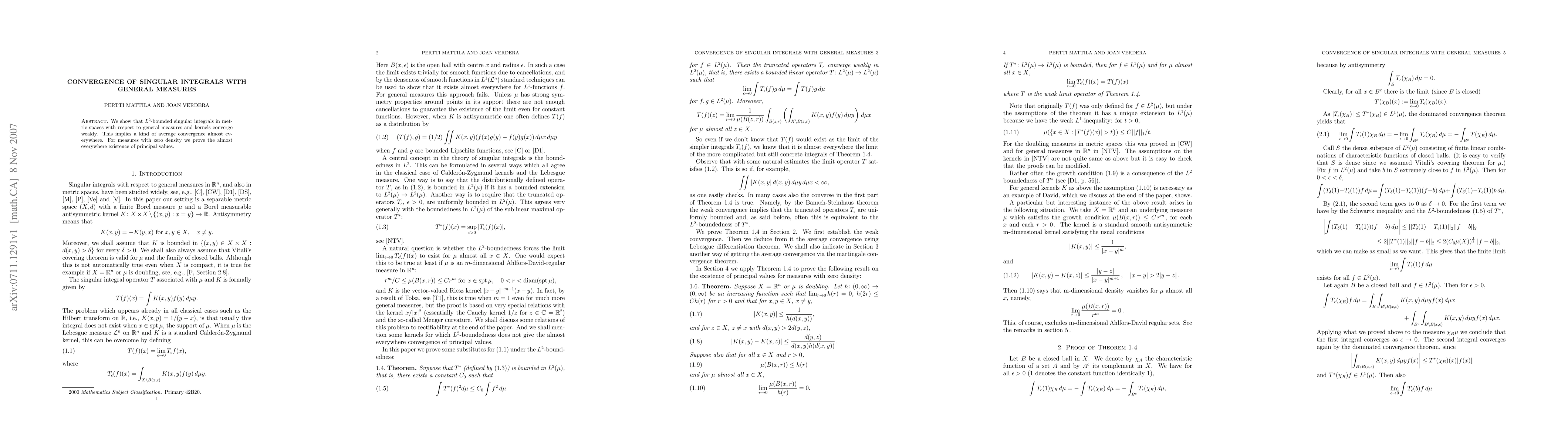 We show that L^2-bounded singular integral in metric spaces with respect to general measures and kernels converge weakly. This implies a kind of average convergence almost everywhere. For measures with zero density we prove the almost everywhere existence of principal values.