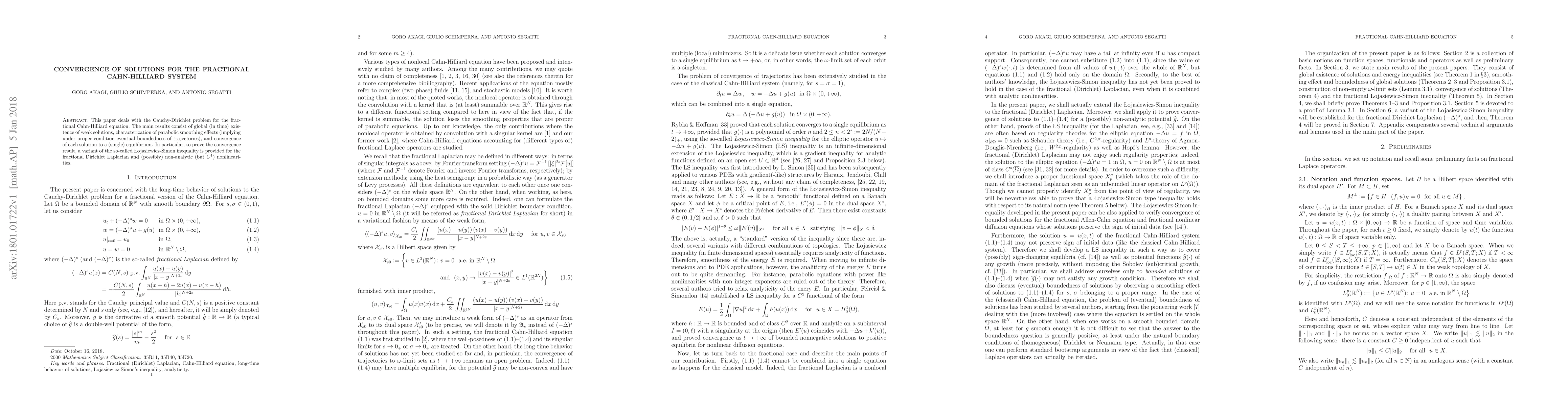 This paper deals with the Cauchy-Dirichlet problem for the fractional Cahn-Hilliard equation. The main results consist of global (in time) existence of weak solutions, characterization of parabolic smoothing effects (implying under proper condition eventual boundedness of trajectories), and convergence of each solution to a (single) equilibrium. In particular, to prove the convergence result, a variant of the so-called \L ojasiewicz-Simon inequality is provided for the fractional Dirichlet Laplacian and (possibly) non-analytic (but $C^1$) nonlinearities.