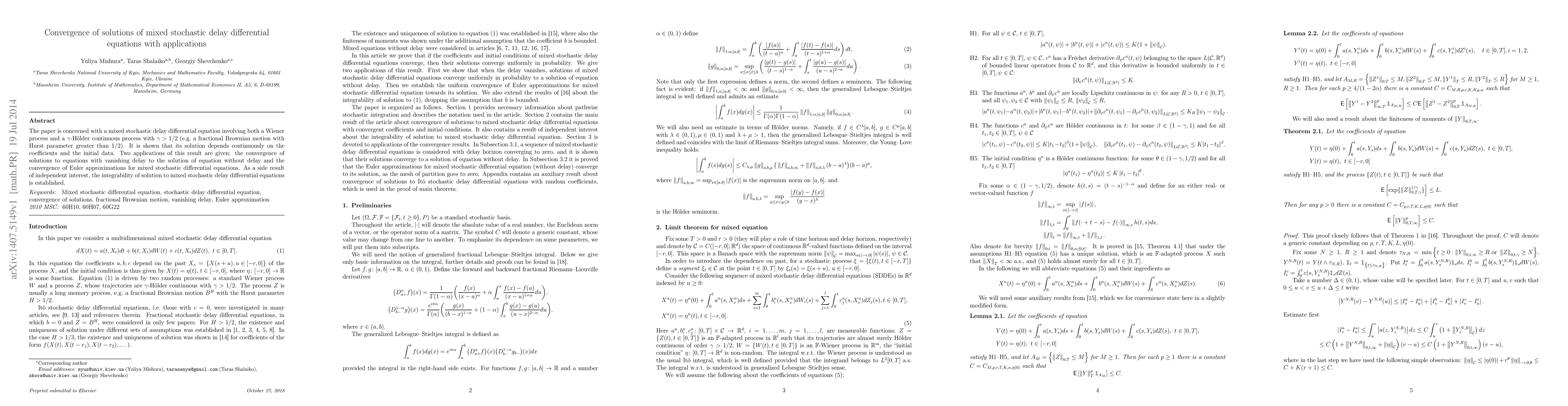 This paper investigates the convergence of solutions for mixed stochastic delay differential equations involving both Wiener processes and $\gamma$-Hölder continuous processes ($\gamma > 1/2$). It demonstrates continuous dependence on coefficients and initial data, with applications to the convergence of solutions without delay and Euler approximations.