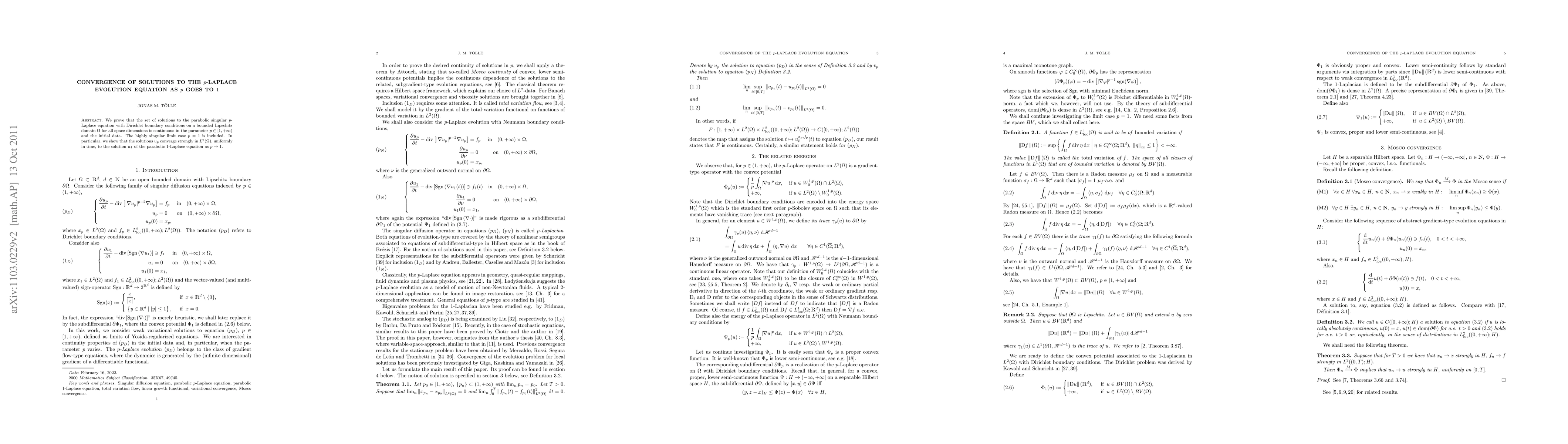 This paper demonstrates that solutions to the $p$-Laplace evolution equation converge strongly in $L^2(\Omega)$ as $p$ approaches 1, including the highly singular limit case $p=1$, showing continuity in the parameter $p$ and initial data.