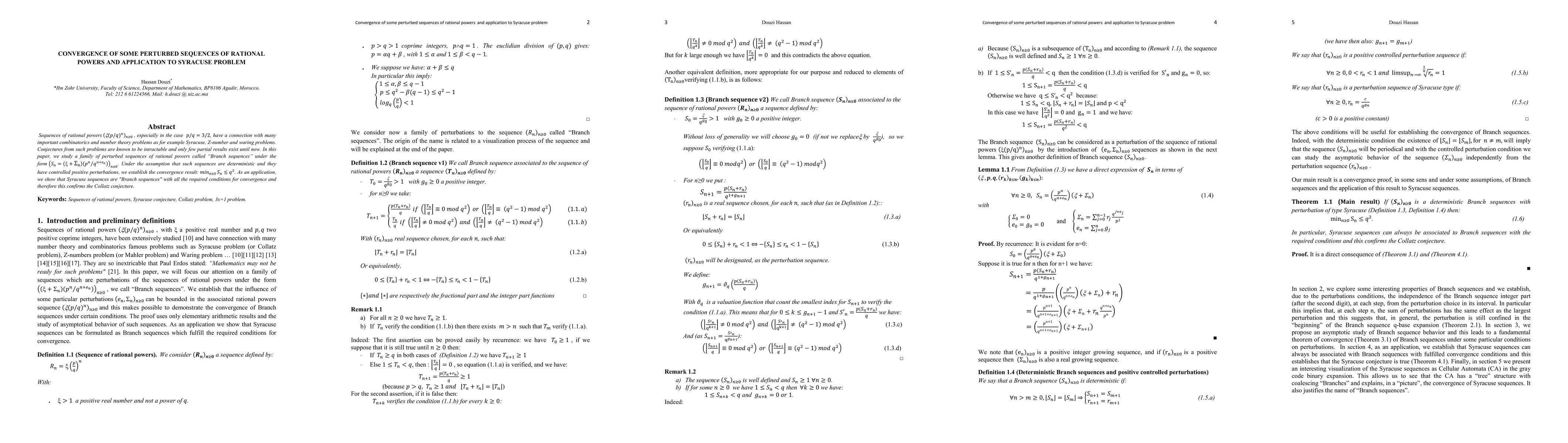 This paper investigates perturbed sequences of rational powers, specifically 'Branch sequences,' and proves their convergence under controlled positive perturbations. It applies these results to the Syracuse conjecture, confirming the Collatz conjecture through the identification of Syracuse sequences as a subset of these Branch sequences.