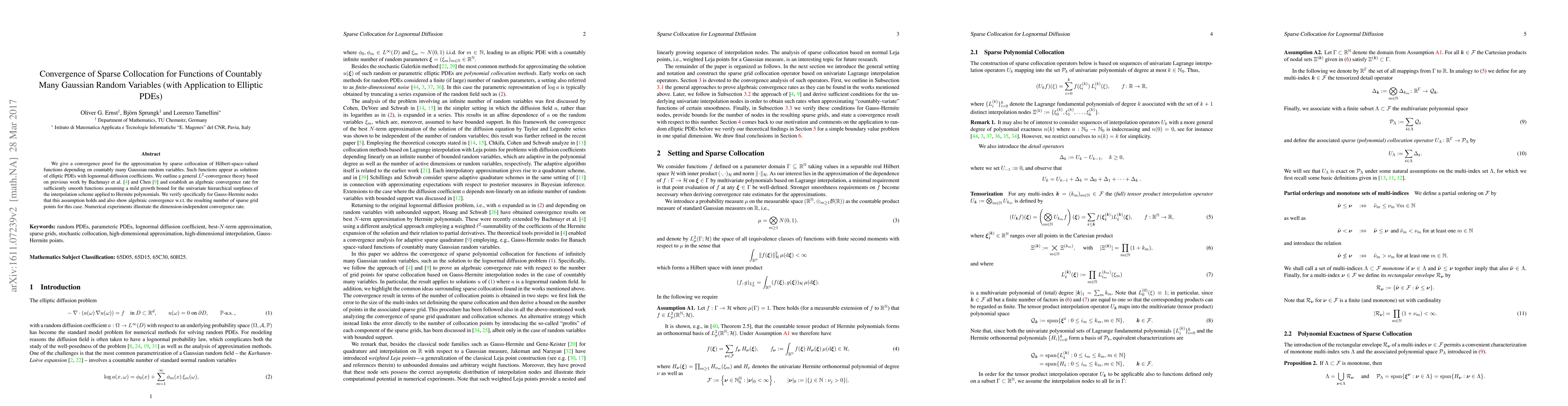 This paper proves the convergence of sparse collocation methods for approximating Hilbert-space-valued functions based on countably many Gaussian random variables, with applications to elliptic PDEs. It establishes an algebraic convergence rate for smooth functions under mild growth conditions, verified for Gauss-Hermite nodes, and demonstrates dimension-independent convergence through numerical experiments.