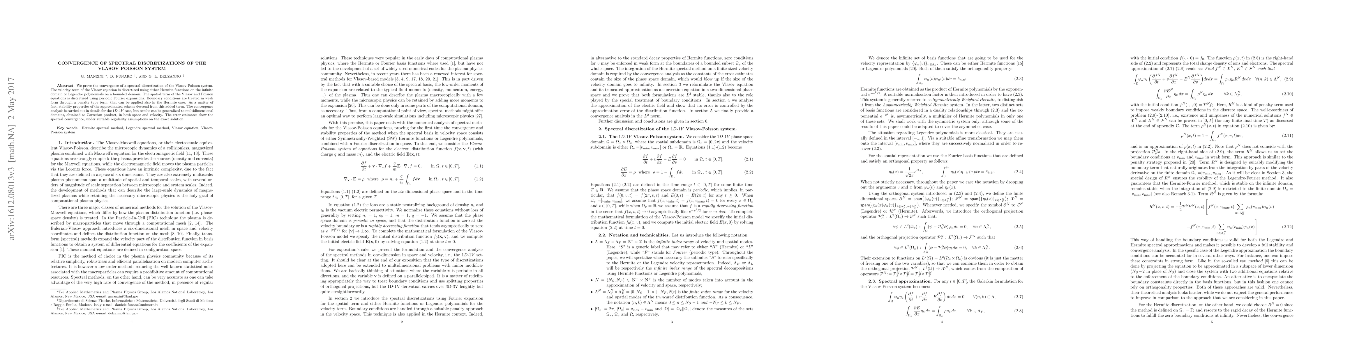 This paper proves the convergence of spectral discretizations for the Vlasov-Poisson system, employing Hermite or Legendre functions for velocity and Fourier expansions for spatial terms. The analysis, detailed for the 1D-1V case, demonstrates spectral convergence and extends to multidimensional domains.