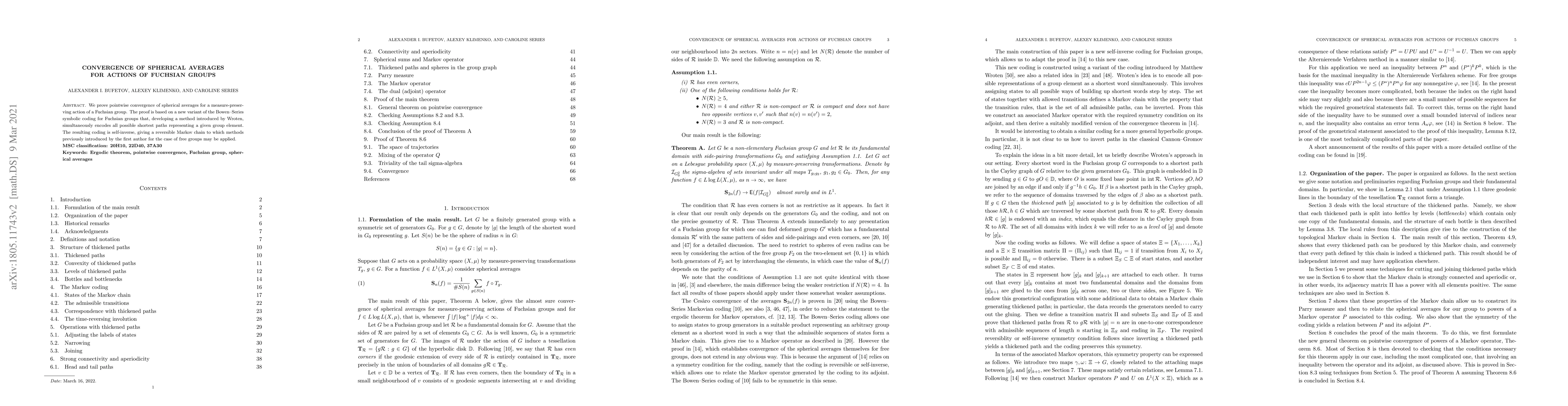This paper proves the pointwise convergence of spherical averages for a measure-preserving action of Fuchsian groups using a new symbolic coding method. This coding, based on a variant of Bowen-Series and incorporating Wroten's approach, creates a reversible Markov chain, enabling the application of previously developed techniques for free groups.