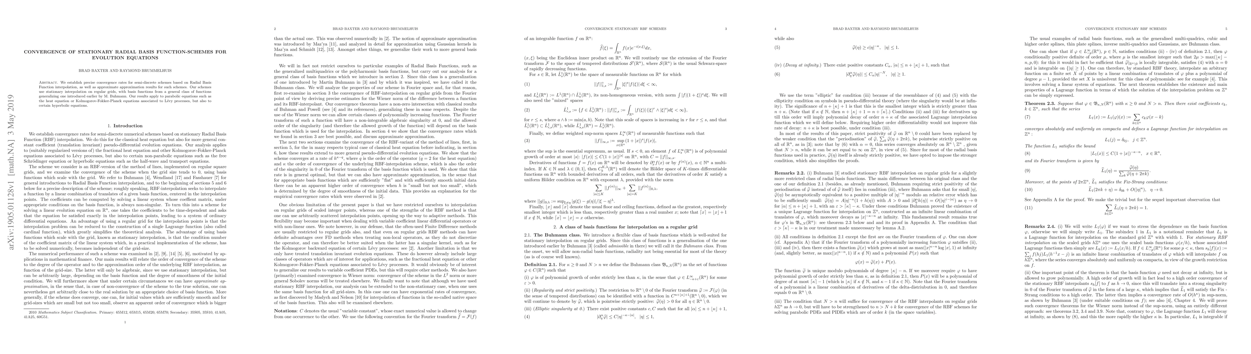 We establish precise convergence rates for semi-discrete schemes based on Radial Basis Function interpolation, as well as approximate approximation results for such schemes. Our schemes use stationary interpolation on regular grids, with basis functions from a general class of functions generalizing one introduced earlier by M. Buhmann. Our results apply to parabolic equations such as the heat equation or Kolmogorov-Fokker-Planck equations associated to L\'evy processes, but also to certain hyperbolic equations.