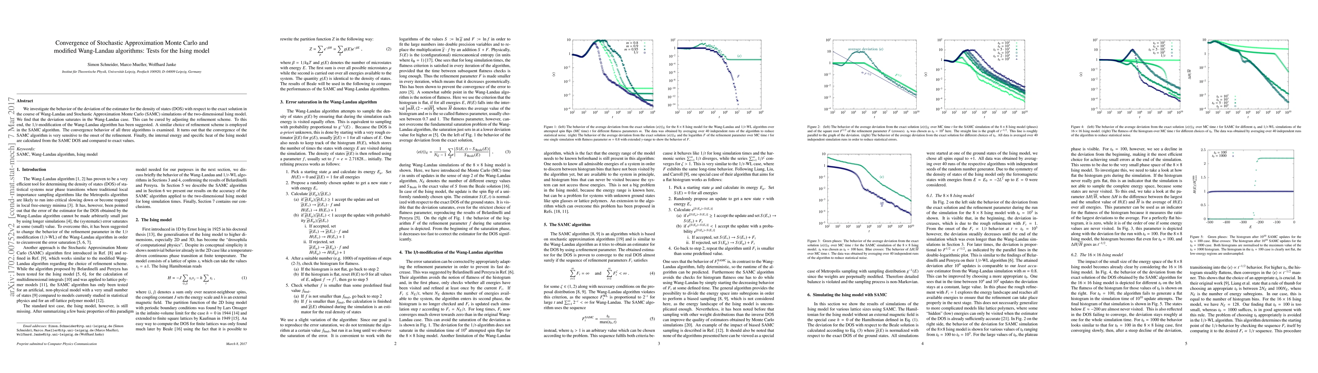 We investigate the behavior of the deviation of the estimator for the density of states (DOS) with respect to the exact solution in the course of Wang-Landau and Stochastic Approximation Monte Carlo (SAMC) simulations of the two-dimensional Ising model. We find that the deviation saturates in the Wang-Landau case. This can be cured by adjusting the refinement scheme. To this end, the 1/t-modification of the Wang-Landau algorithm has been suggested. A similar choice of refinement scheme is employed in the SAMC algorithm. The convergence behavior of all three algorithms is examined. It turns out that the convergence of the SAMC algorithm is very sensitive to the onset of the refinement. Finally, the internal energy and specific heat of the Ising model are calculated from the SAMC DOS and compared to exact values.